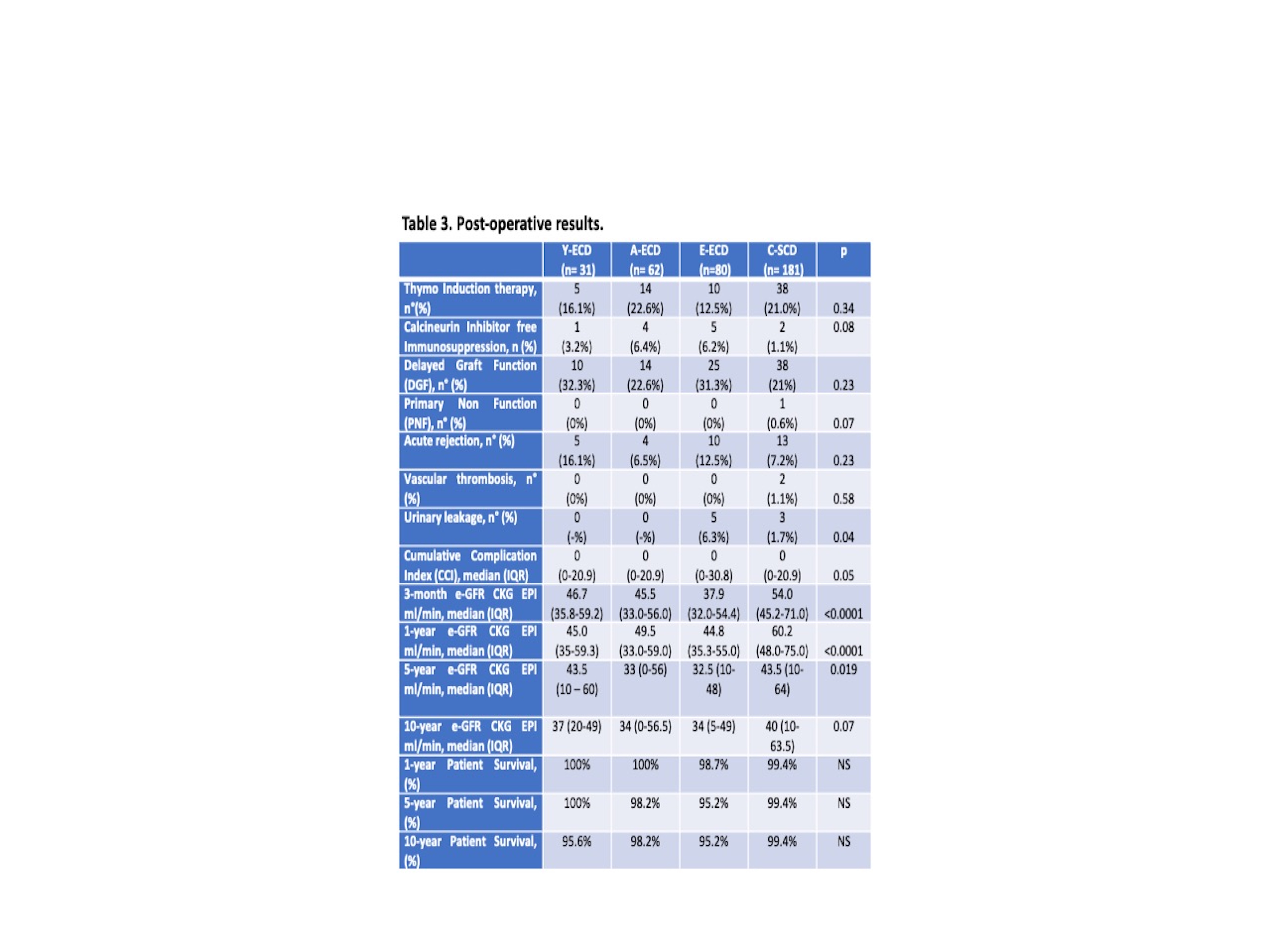 Conclusion: The SKTx from E-ECD present a significantly lower e-GFR compared the others ECD and to C-SCD. Nevertheless, all SKTx from any ECD have post-operative outcome similar to C-SCD and comparable patient and graft survival, in short and long-term. E-ECD, when used for SKTx, should be used in carefully selected recipients with limited needs in terms of depuration (older, small in size, little musculature). Moreover, a larger use of calcineurin inhibitor free immunosuppressive regimens could improve results in long term.