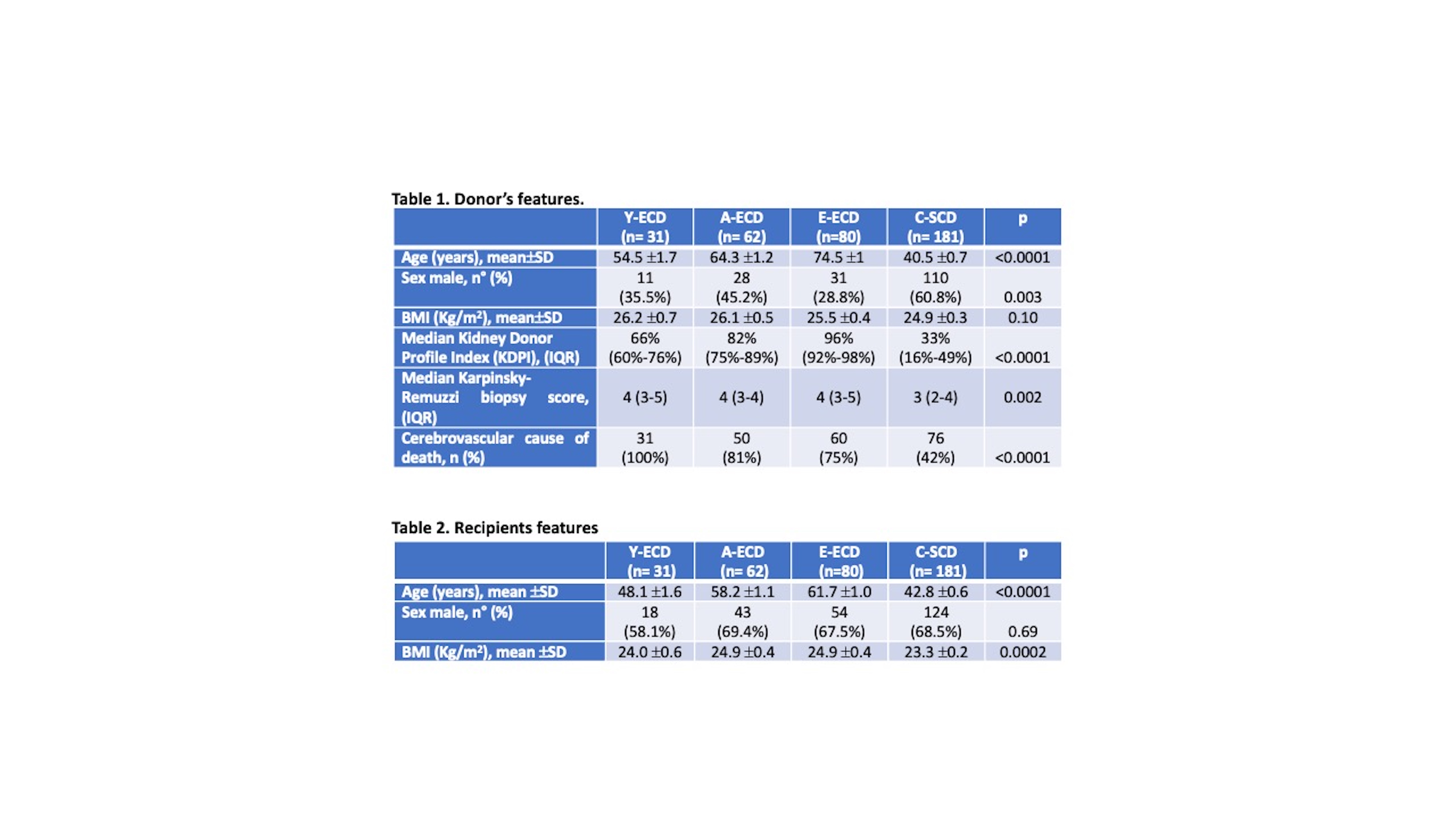 Results: Overall 354 patients underwent SKTx: mean donors age was 53.6 ±17.1 years, mean BMI was 25.4 ±3.9. C-SCD-n=181 and 173 (48.9%) were from ECD, stratified as follows: Y-ECD-n=31, A-ECD-n=62, E-ECD-n=80. The main characteristics of the donors and recipients in the study population are reported in the Table 1 and 2. he groups presented differences in donors age (p<0.0001), median KDPI (<0.0001), median Remuzzi-Karpinsky biopsy score (p= 0.002) and rate of cerebrovascular events as cause of donors death (p<0.0001). The main results of the analysis are reported in the Table 3. Regarding the outcomes, there were no differences in terms of PNF, DGF, CCI, acute rejection and vascular thrombosis rates. The urinary leakage occurred more frequently in E-ECD (p=0.04). The 3-month e-GFR have been superior in C-SCD than the other three groups (p=0.01 vs Y-ECD; p<0.0001 vs A-ECD; p<0.0001 vs. E-ECD). Same advantage in favor of C-SCD was recorded for 1-year and 5-years eGFR (p<0.0001 and p=0.019).