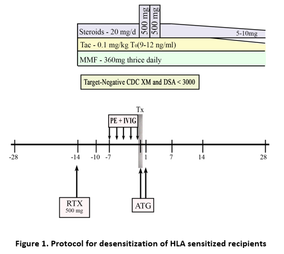 Method: The study was conducted at NH Rabindranath Tagore International Institute of Cardiac Sciences (NH-RTIICS), Kolkata, a tertiary level multispecialty hospital in the city of Kolkata, West Bengal. It was a prospective, observational study. Inclusion criteria were pre-desensitization findings of CDC cross match positivity up to 21% to 40%,Flow Cytometry crossmatch positivity, DSA and/or SAB positivity. Deceased donor transplants and multiorgan transplant recipients were excluded. A total of 17 HLA sensitized living-donor kidney transplant recipients who underwent desensitization according to institutional protocol were enrolled. Each patient was followed up for one year or till mortality, if earlier.