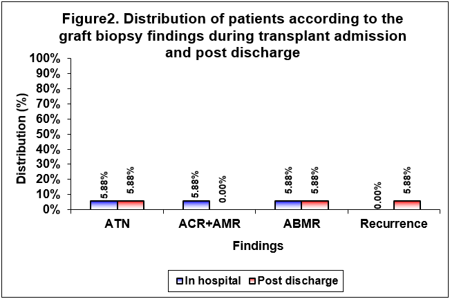 Result: Death censored graft survival was 100%. Patient survival was 76.47%. The mean serum creatinine among survivors at 12 months was 1.21±0.62 mg/dl and mean eGFR was 68.86±20.46 mL/min/1.73m2 . All the survivors at one year had functioning graft. Among the three patients who underwent graft biopsy in the immediate post-transplant period before discharge, ATN, ACR+ABMR and ABMR were noted in one case each (5.88%). Post discharge, three patients required graft biopsy, which showed ATN, ABMR and recurrence in one case each (5.88%). The overall incidence of biopsy proven early ABMR (i.e., within one year) was 17.65%.