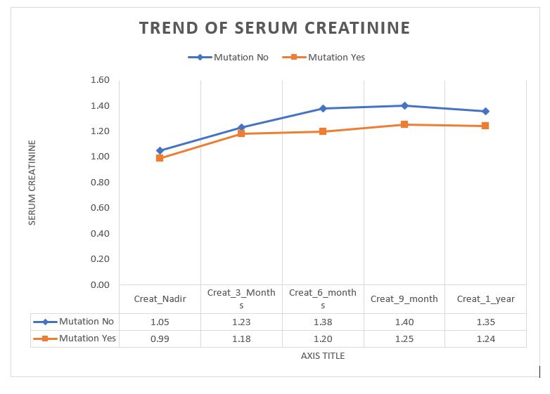 There was no significant difference in serum creatinine levels of patients with or without CRG mutation at the end of 1 year.