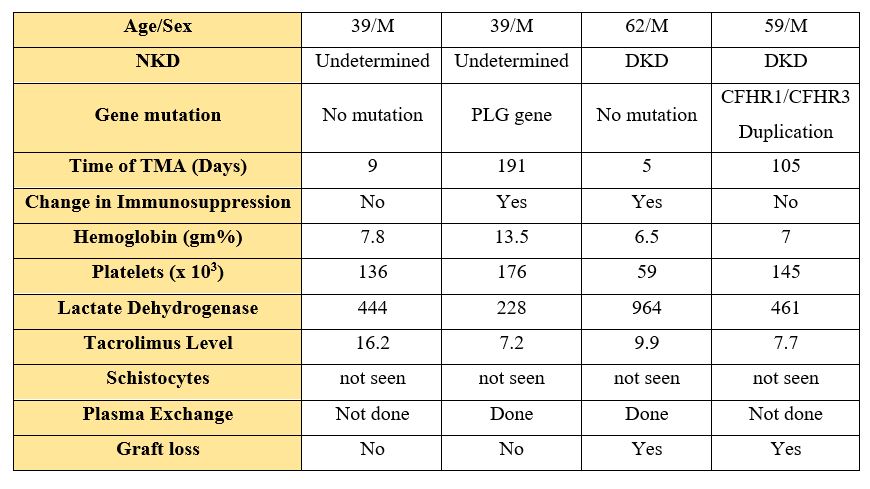 Introduction: Thrombotic Microangiopathy is an occlusive disorder of microvasculature characterized by thrombocytopenia, systemic or intrarenal platelet aggregation, thrombus formation and hemolytic anemia caused by fragmentation of erythrocytes due to the disturbed microvasculature. TMA developing after renal transplantation can be categorized into either De novo TMA, developing for the first time without any evidence of the disease before the transplant or recurrent TMA where native kidneys have failed due to TMA and recur after kidney transplantation. The contribution of complement regulatory gene (CRG) mutation to post-transplant Thrombotic Microangiopathy (TMA) in Indian kidney transplant recipients (KTR) is unknown. This is a study to determine the association of CRG on post-transplant TMA and graft failure.