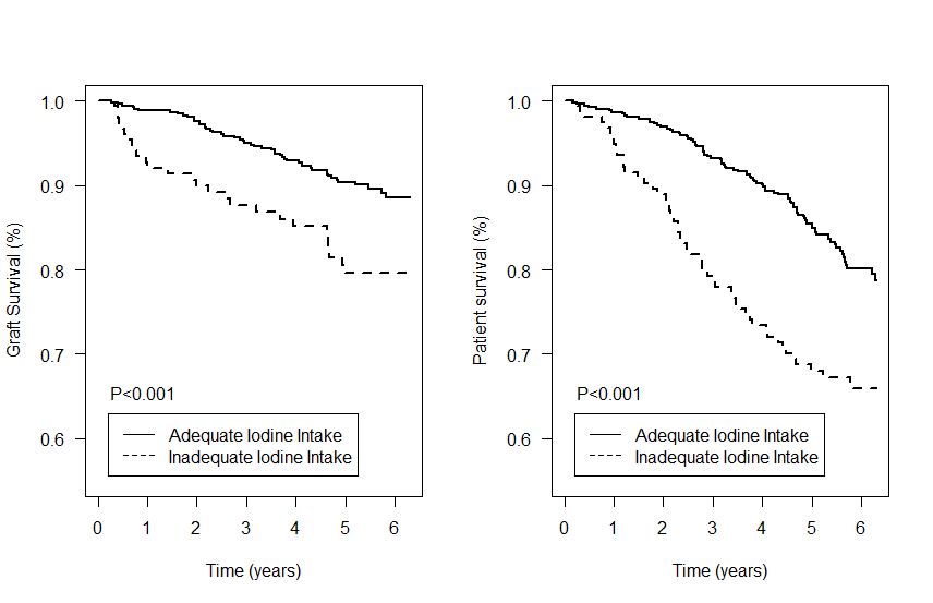 Conclusion: Inadequate iodine intake is prevalent among KTR, and its occurrence appears to be strongly related to dietary factors, including salt intake. Inadequate iodine intake was strongly and independently associated with an increased risk for graft failure and all-cause mortality. These results suggest that supplementation of iodine may reduce risks of graft failure and premature mortality among KTR. Interventional trials are necessary to confirm the potential of stimulating dietary iodine intake or iodine supplementation in KTR.