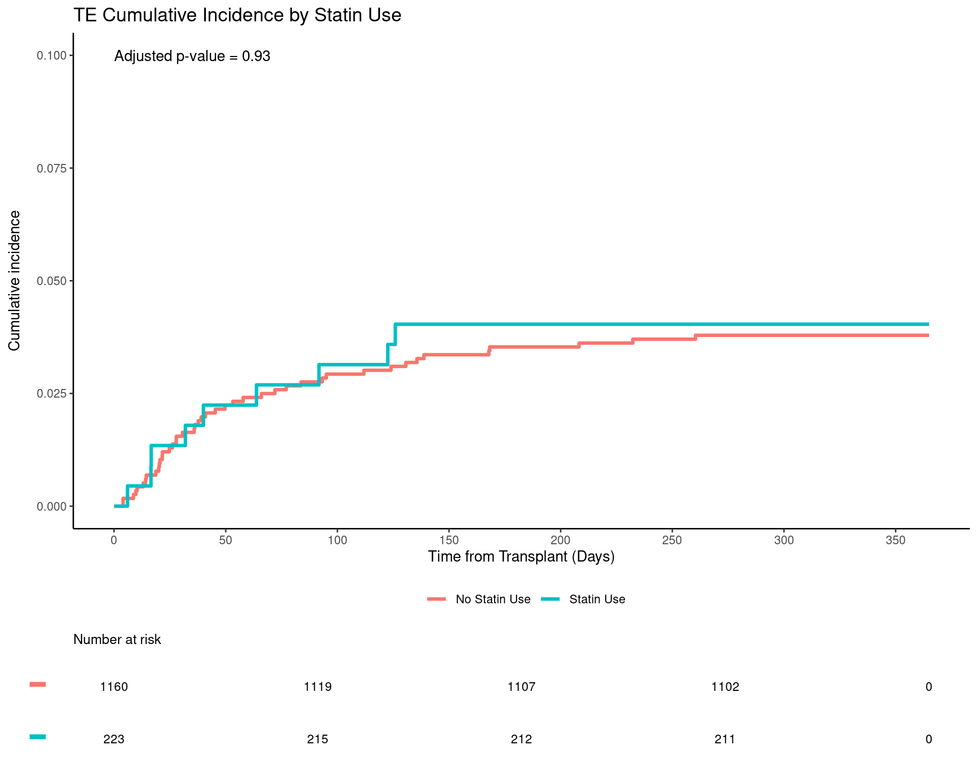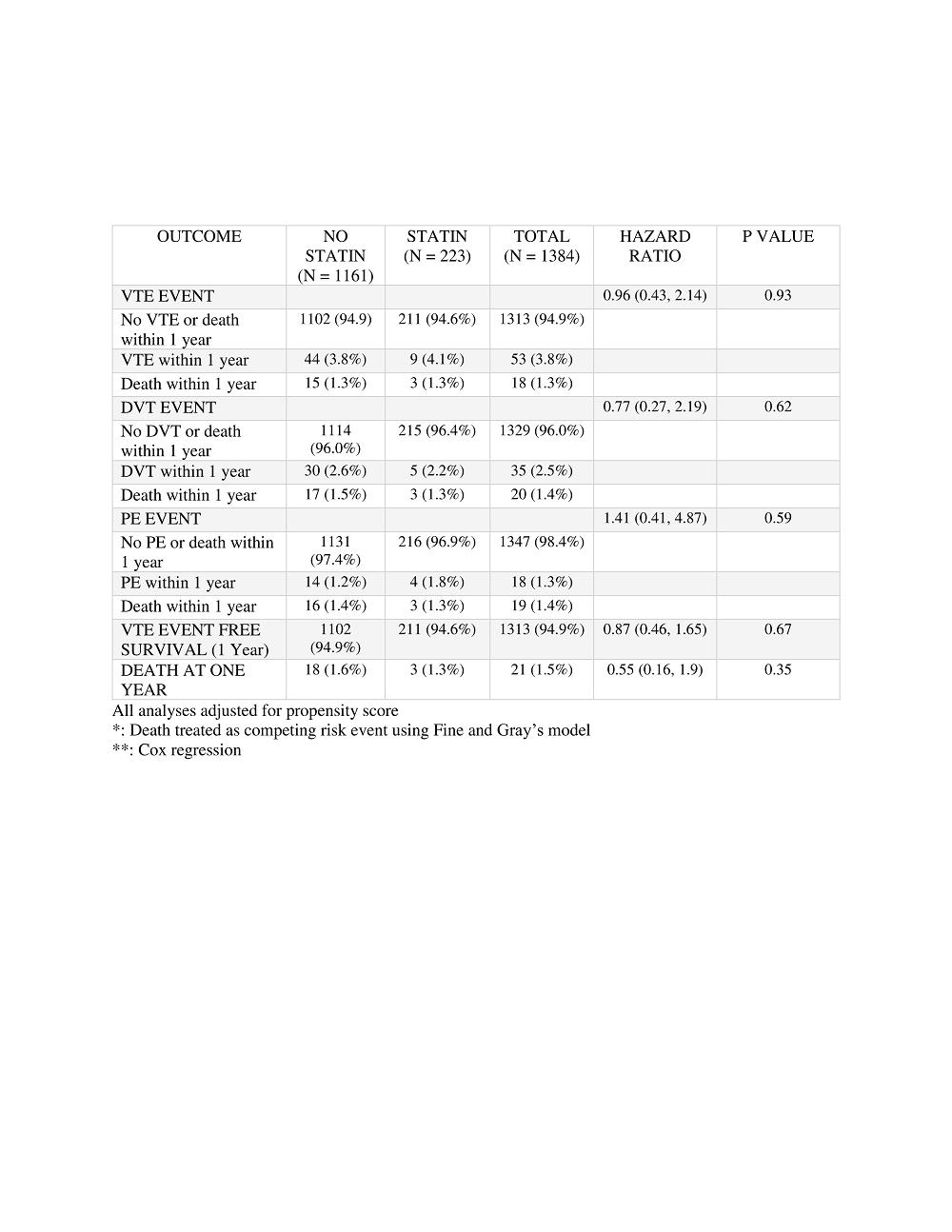 Results: Sustained statin therapy in the first year following transplant was observed in 16.1% (n=223) of 1384 kidney transplants included in the study cohort. The control group of 1161 patients had no statin exposure during the first year following KT. Demographic and perioperative characteristics are presented in Table 1. The overall incidence of VTE events in the year following kidney transplant was 3.8%. VTE occurred in 4.1% of recipients treated with statins and 3.8% of the controls – (hazard ratio [HR] 0.96, 95% confidence interval [95% CI] 0.43, 2.14, P = 0.93) (Table 2).