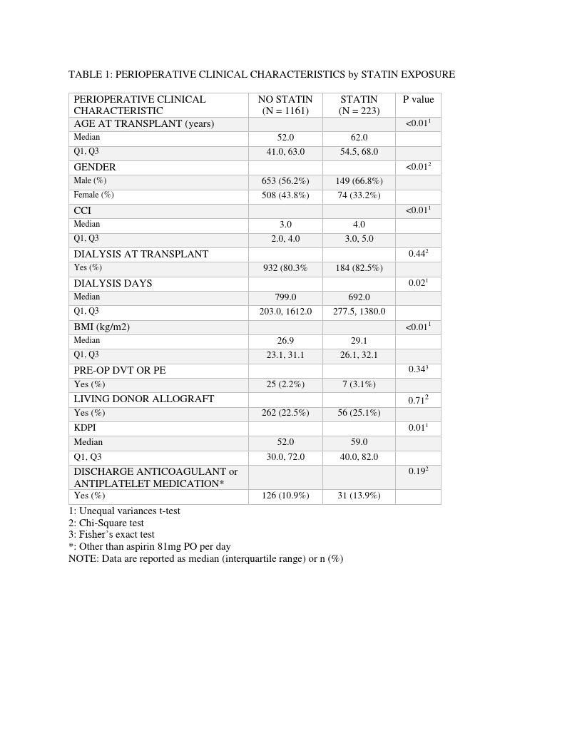 Conclusion: In this single center, retrospective investigation, statin therapy in the year following successful kidney transplant was not associated with a reduction in risk of VTE. Although previous investigations have demonstrated ameliorative effects of statin therapy on rejection, VTE, cancer recurrence and vasculopathy following liver, heart and lung transplantation, the current study and others have failed to confirm any such benefit in the kidney transplant population.