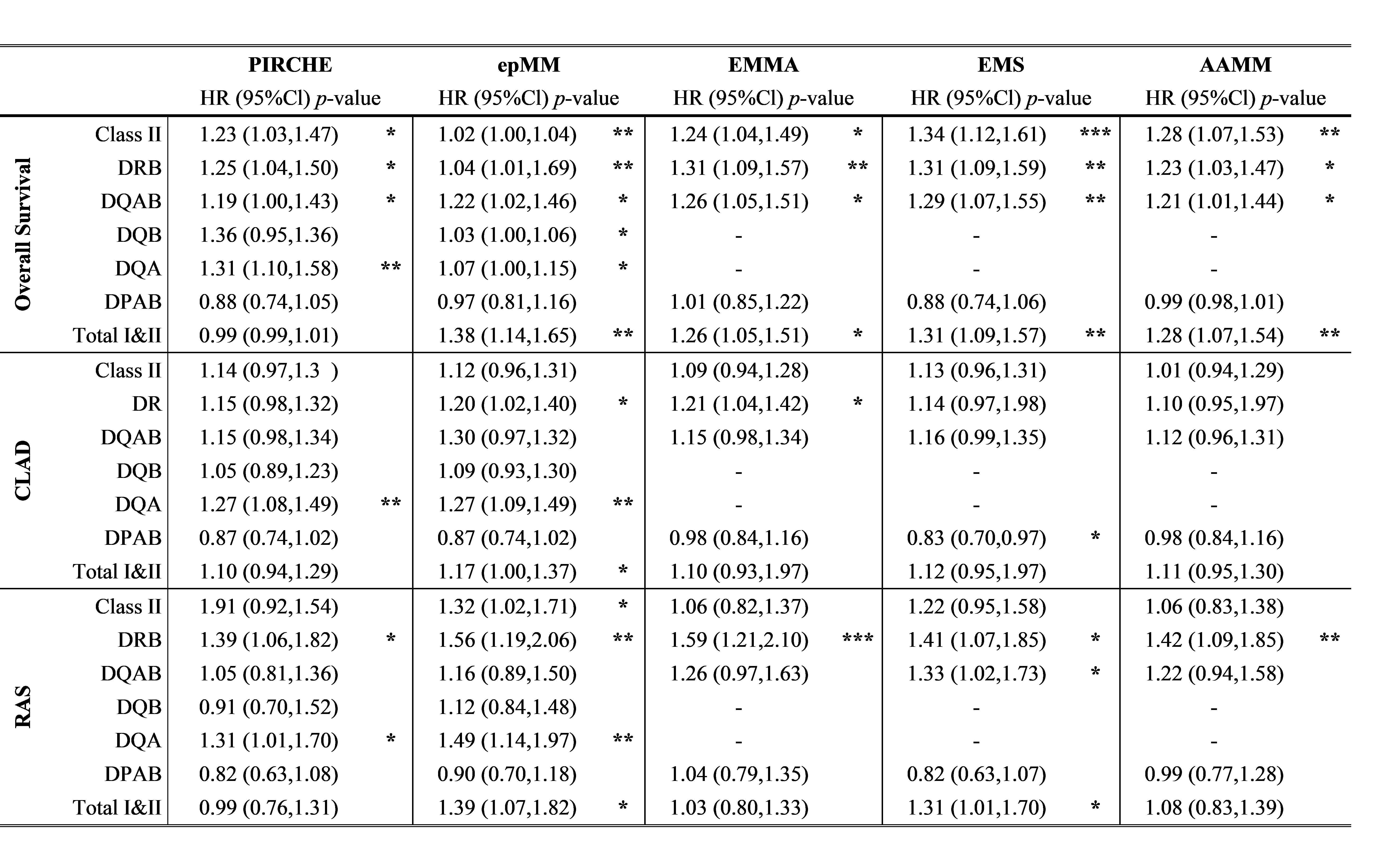 Results: Lower HLA-class II compatibility was associated with increased overall survival for all algorithms, with lower HLA-DR, -DQ and –DQA mismatches generated by PIRCHE and epMM independently associated with increased survival. Lower HLA-DR compatibility was significantly associated with increased time to RAS for all algorithms. Lower epMM and PIRCHE HLA-DQA was also associated with increased time to RAS, however the algorithms that did not separate DQA and DQB, did not reach significance.