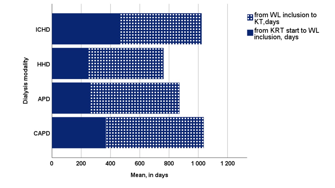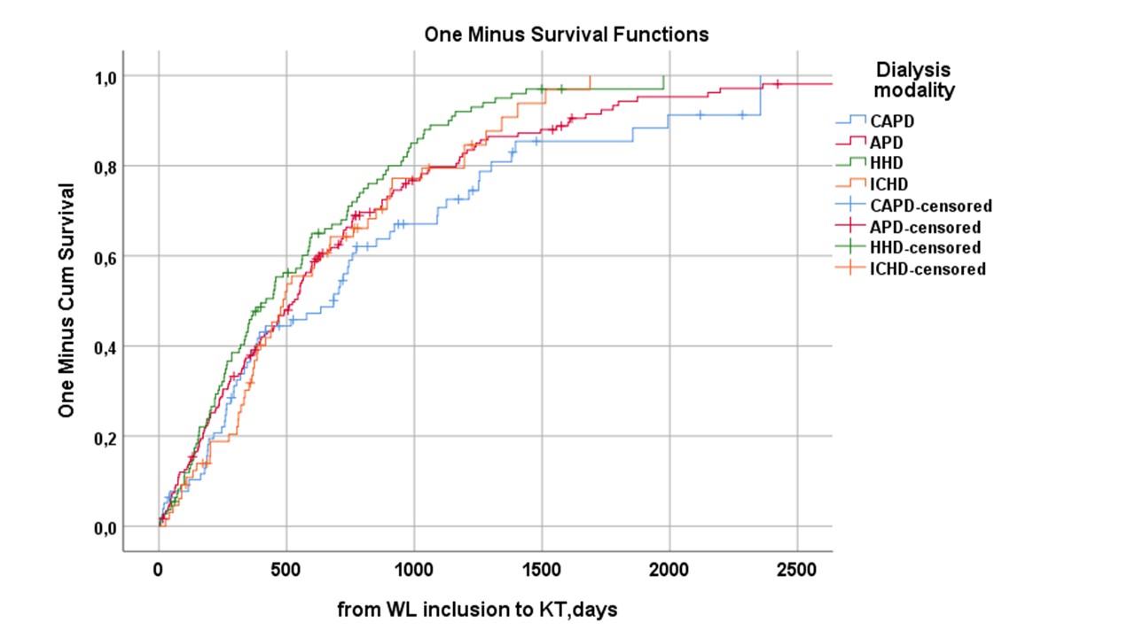 Conclusions: Dialysis modality significantly influences patients’ access to transplantation. APD and HHD modalities provided a benefit in terms of accessing the WL. In patients wait listed, intercurrent complications during dialysis, mainly infections, significantly prolonged the waiting time for KT in all patients beyond immunological reasons.