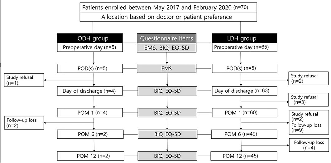 Material and Methods: From May 2017 to February 2020, 70 liver donors who underwent donor hepatectomy (DH) were enrolled, and questionnaire items such as Enhanced Recovery after Surgery (ERAS) mobility scale (EMS), Body Image Questionnaire (BIQ), and EQ-5D-3L were examined up to one year after DH to evaluate postoperative recovery, body image satisfaction, and health status, respectively. During the study period, 45 LDH donors and two ODH donors were finally fully evaluated (Figure 1).