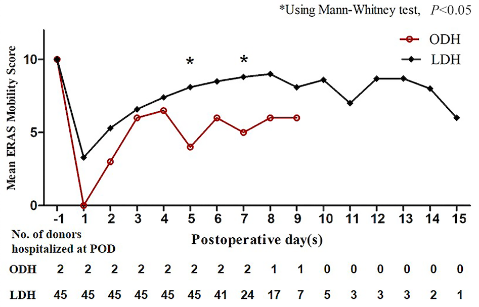 Results: Two patients in the OLH group were discharged on POD 8 and POD 10, respectively, with neither of the two achieving the level of being independently mobile (EMS ≥8). On the contrary, patients in the LDH group were considered independently mobile from POD 5 based on the mean EMS of 45 patients. The LDH group had a significantly higher mean EMS than the ODH group on POD 5 and 7 (P = 0.011, and P = 0.004, respectively, Figure 2).