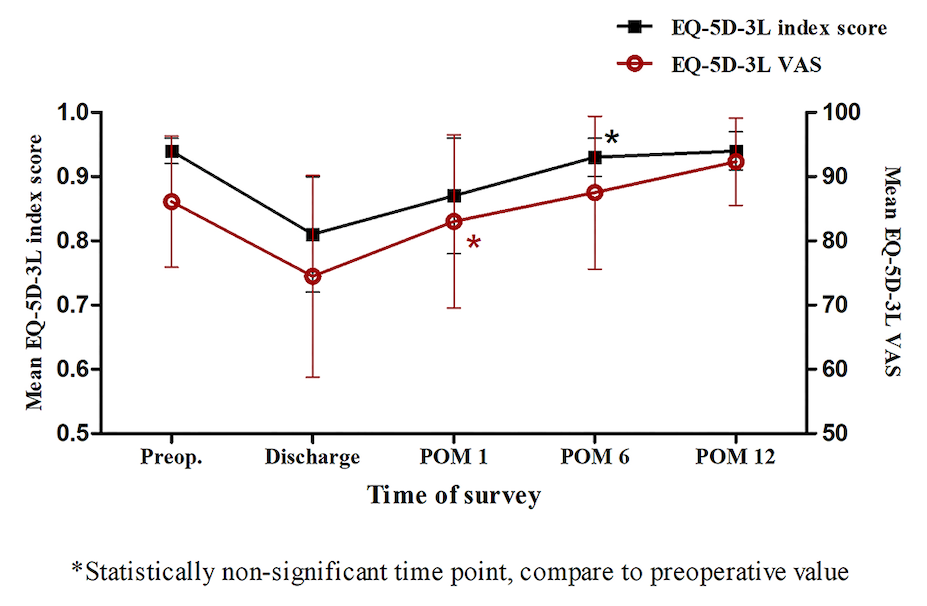 Body image score of the LDH group was significantly higher than that of the ODH group at one month after DH (17.8 vs. 15.0, P = 0.017). EQ-5D-3L index value and EQ-5D-3L VAS were not different from preoperative values at six months (P = 0.059) and one month (P = 0.217), respectively (Figure 3).