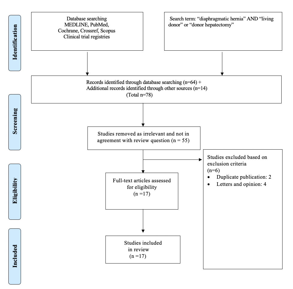 Background: Living donor hepatectomy (LDH) is a complex and complicated surgical procedure with reported morbidity of 10 - 41 %. Although, the majority of these complications fall under Clavien Dindo grade I/II. Diaphragmatic hernia (DH) is one of the life-threatening and under-reported complications observed following LDH. The aim of this study is to determine the incidence of DH following LDH and identify implicating causative factors through a review of literature.