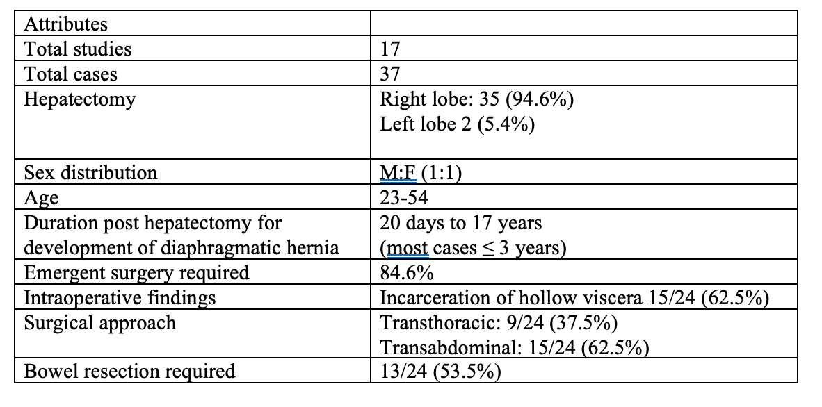 Results: Based upon the available data from the included studies and 7062 subjects who underwent LDH. Median patient age was 43 years (range 23-54) and most of the cases presented following right lobe hepatectomy 94.6% (35/37) within a period of <3 years. Incarceration of hollow viscera through diaphragmatic defect was presenting intraoperative feature in 62.5% donors, of which resection of bowel was required in 53.3% (Fig 2). Further, all patients had an uneventful postoperative recovery and were discharged in a satisfactory state with no reported recurrence in the literature.