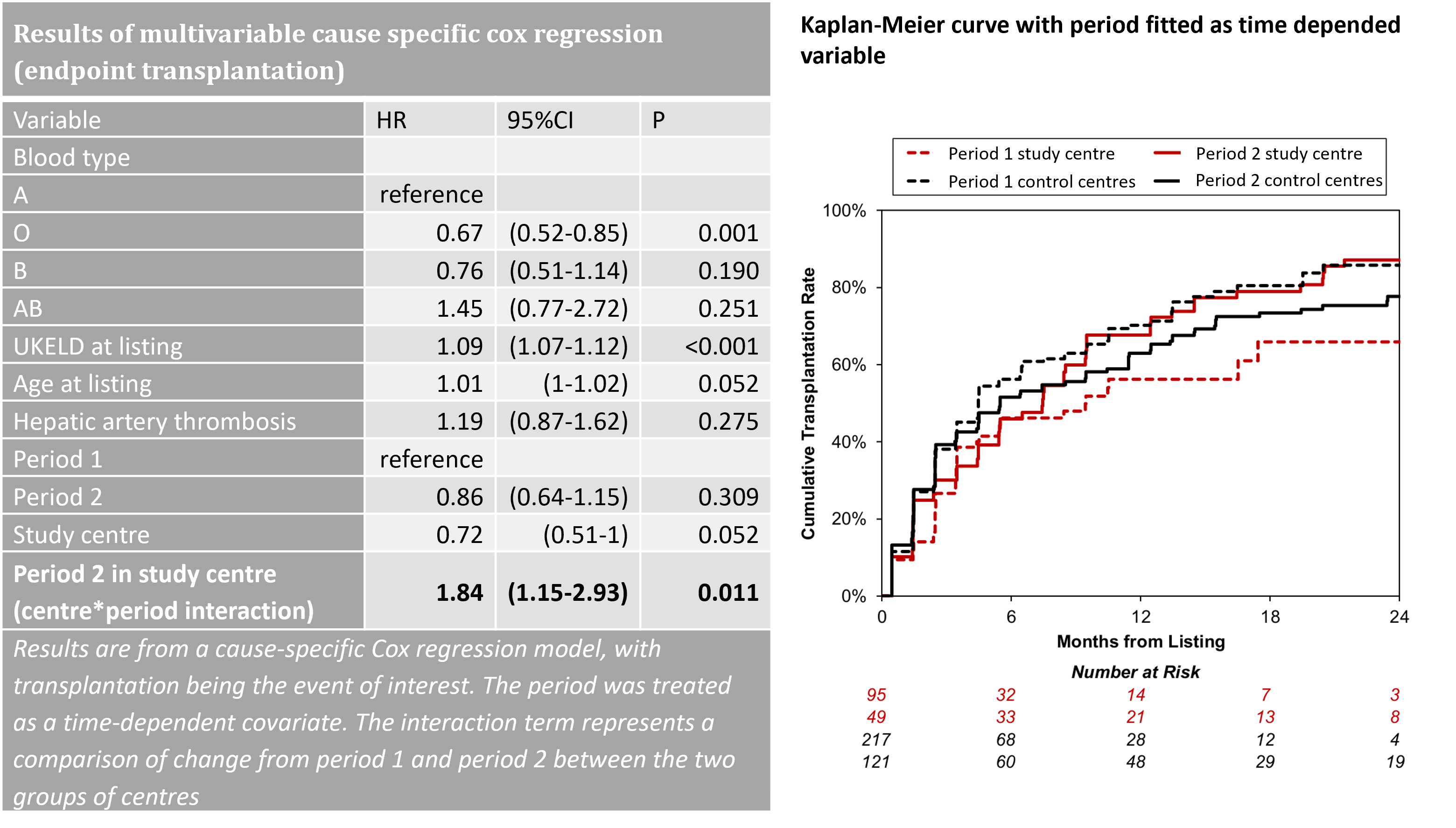 Results: A total of 144 and 338 LLrT candidates were listed in the study and control centres respectively. At the study centre, the likelihood of transplantation within one year of listing increased from 56% to 68%, whilst a reduction in the LLrT rate was observed at other centres (Figure). Multivariable analysis, showed improved transplant access at the study centre in period 2 (period*centre interaction: HR: 1.83, 95%CI: 1.15-2.9, p=0.01). Post-transplant graft survival was not affected by the intervention (HR: 1.06, 95%CI: 0.41-2.69, p=0.903).