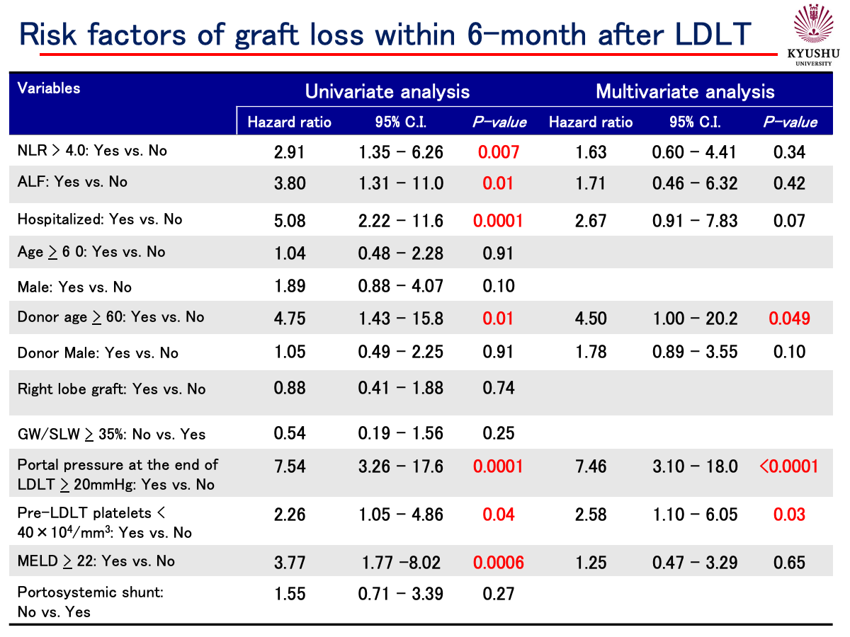 Results: Mean recipient age was 55 years. Mean donor age was 38.7 years. Two hundred and five patients (46.5%) received left lobe graft. Mean graft weight (GW)-standard liver weight ratio was 41.5% and GW-recipient weight ratio was 0.79%. Six-month graft survival rate after LDLT in 441 patients was 93.8%, which was significantly better compared to patients without simultaneous splenectomy or splenic artery ligation (83.9%, p<0.0001). Univariate analysis revealed the following risk factors for 6-month graft mortality in patients with splenectomy: neutrophil-lymphocyte ratio > 4, acute liver failure, hospitalized before LDLT, donor > 60 years of age, MELD score > 22, pre-LDLT platelet < 40, 000/mm3, portal vein pressure when LDLT finished (PVP) > 20 mmHg. Multivariate analysis identified that donor > 60 years of age (Hazard ratio=4.50, p=0.049), pre-LDLT platelet < 40, 000/mm3 (Hazard ratio=2.58, p=0.03), and PVP > 20 mmHg (Hazard ratio=7.46, p<0.001) were the independent risk factors of 6-month graft mortality after LDLT.