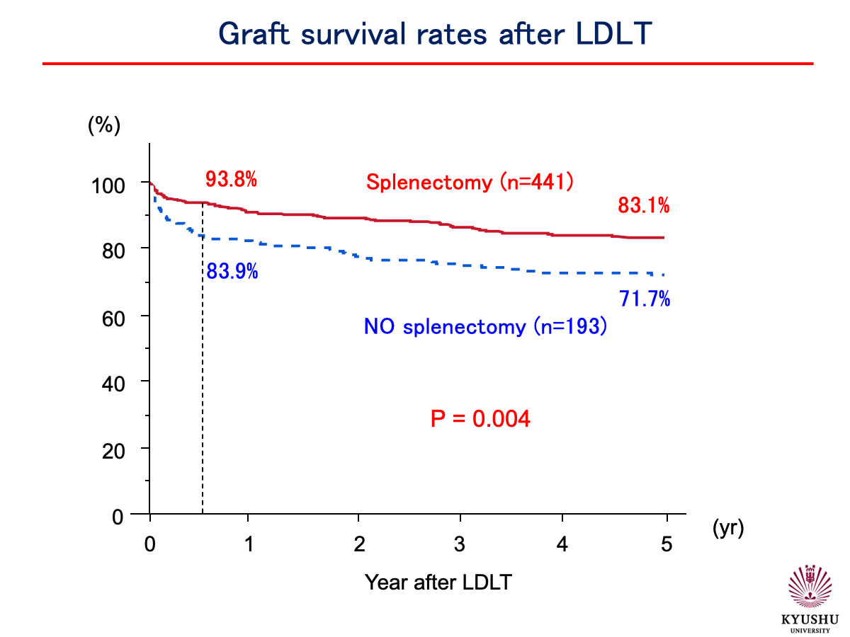 Conclusion: Splenectomy in LDLT improves survival rate after LDLT. Careful attention is needed for patients with platelet < 40, 000/mm3, PVP > 20 mmHg, and received graft from donor > 60 years of age.