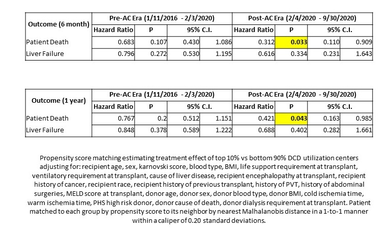 Methods: All adult DCD transplant recipients in the UNOS STAR file from Jan 11 2016 to Sept 30 2021 were included. Living liver grafts, pediatric, and non-kidney simultaneous transplantation were excluded. The top decile of DCD transplant centers by volume per year were identified. 6-month and 1-year patient and liver graft survival were compared to bottom 90% usage centers using propensity score matched fine gray regression models. Outcomes were stratified by pre-AC (1/11/2016-2/3/2020) and post-AC (2/4/2020-9/30/2020) eras. Transplant recipients that cross eras were censored on last day of the pre-AC era.