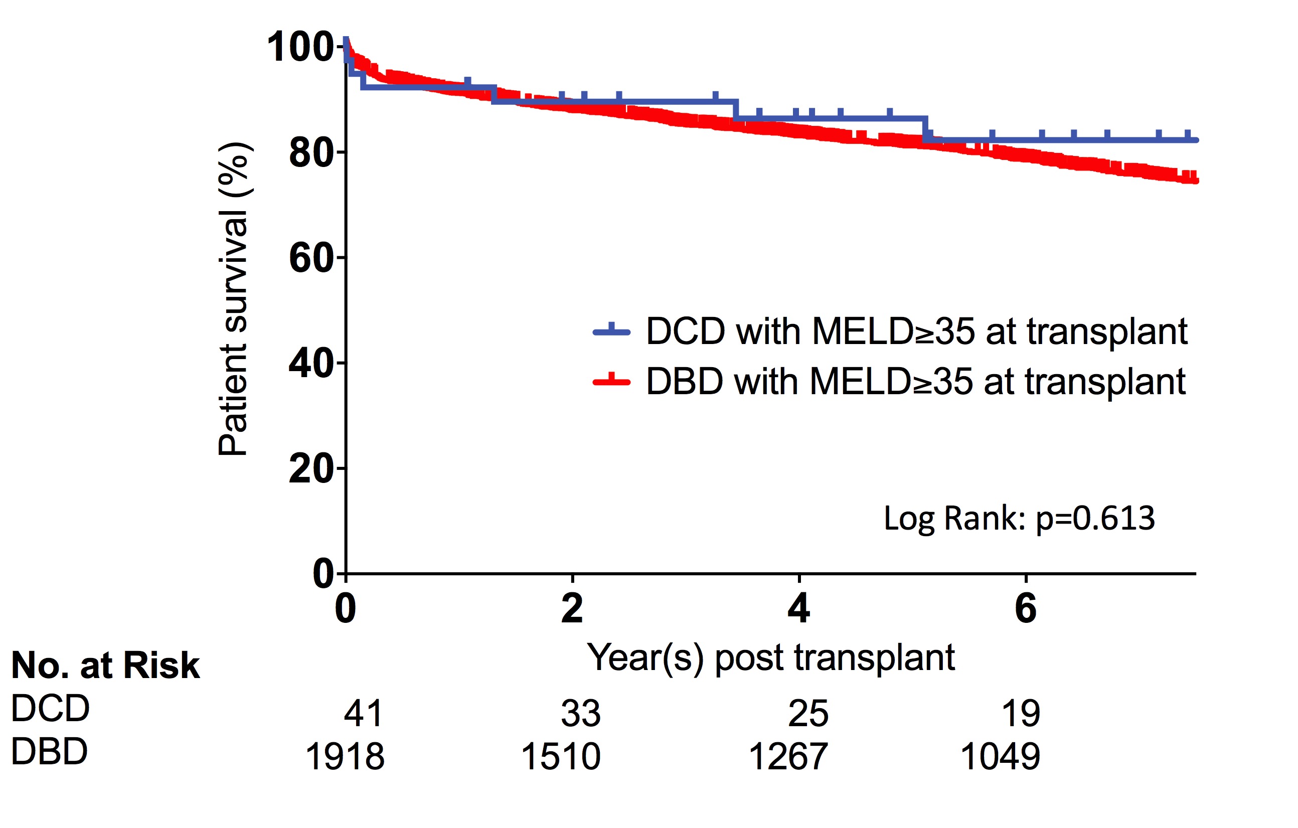 Methods: We collected and analyzed data on adult DCD recipients from the University of California, San Francisco (UCSF) cohort who had a lab-MELD of ≥35 at listing (n=41). No machine perfusion was used. We compared survival (Kaplan-Meier and Log Rank test) with our historical donation after brain death (DBD) recipients who had a lab-MELD of ≥35 at transplant (n=1,918).