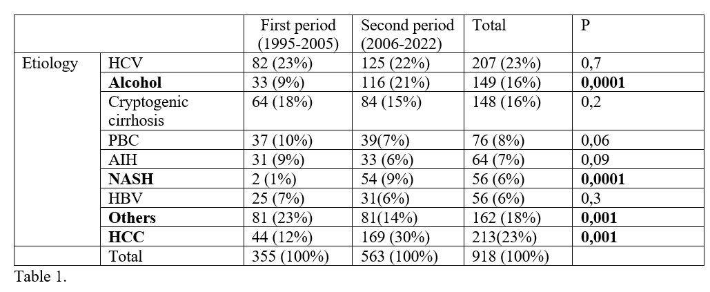 Conclusion: Alcoholic liver disease, HCC and NASH had significantly increased in our second period of evaluation. According to current published international results, our center presents’ comparable results to other local, regional and international centers.