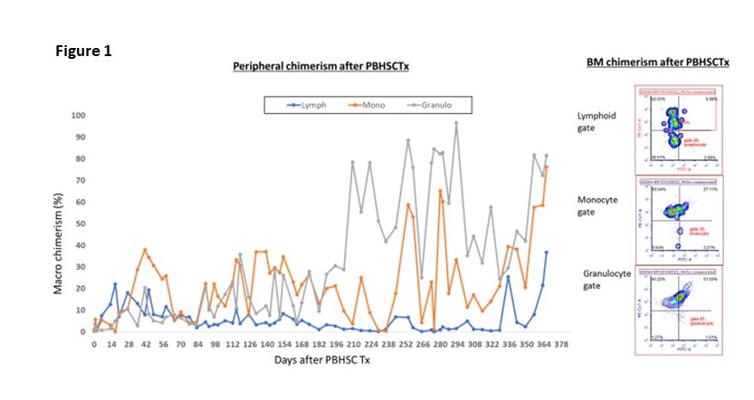 Results: All animals developed and maintained multilineage chimerism with evidence of bone marrow (BM) engraftment throughout the experimental period. However, all animals who received PBHSCTx with high numbers of CD34+ cells (Group 1) were euthanized due to GVHD or cytokine storm at early time points (Days 33, 43, 45, 55, 92). In contrast, recipients who underwent PBHSCTx with lower numbers of CD34+ cells at 2x10^7 cells/kg bwt (Group 2) had no evidence of GVHD or cytokine storm and had significantly prolonged survival (p<0.02). Although two animals were euthanized at Day 118 and 218 days due to CMV infection, all animals maintained macrochimerism throughout the experimental period. All three animals who received appropriate CMV therapy had stable clinical courses, and accepted kidneys (two from actual HSCTx donors and one from a donor with Class II DRα matched to the HSC donor) that were transplanted 42 days after PBHSCTx without any episode of rejection crisis (currently >368, >194 and >143 days). Notably, the longest-term follow-up animal (>368 days) maintains multilineage peripheral chimerism as well as clear BM chimerism. Furthermore, in vitro data showed donor-specific unresponsiveness in vitro and donor-derived recent thymic emigrants.