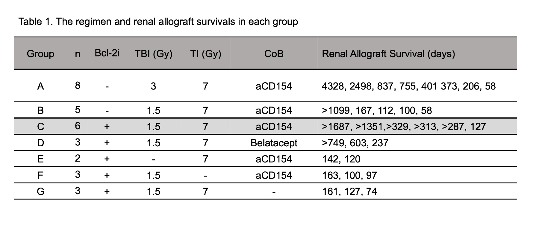 Conclusion: Bcl-2 inhibition with Vntx significantly promoted mixed chimerism and renal allograft tolerance without myelosuppressive complications. A minimal non-toxic dose of TBI, TI, and CoB were still required for chimerism and allograft tolerance induction even with Bcl-2 inhibition.