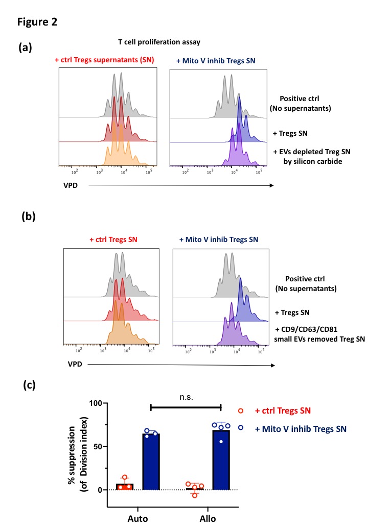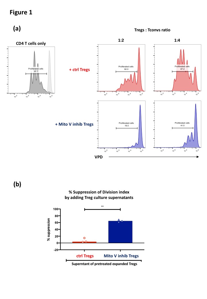 Methods: Human CD4+CD25+CD127lo/- Tregs were flow sorted from peripheral blood mononuclear cells of healthy donors and expanded for two weeks in vitro in the presence of anti-CD3/anti-CD28 beads. Expanded Tregs were pre-treated by mitochondrial complex V inhibitor prior to the in vitro suppression assay to assess their suppressive function. To assess immunosuppressive soluble molecules, Treg culture supernatants were collected. To further identify these molecules, 100kDa ultracentrifugation filter and small extracellular vesicles depletion kits were applied to the supernatant prior to adding to T cell proliferation assay.