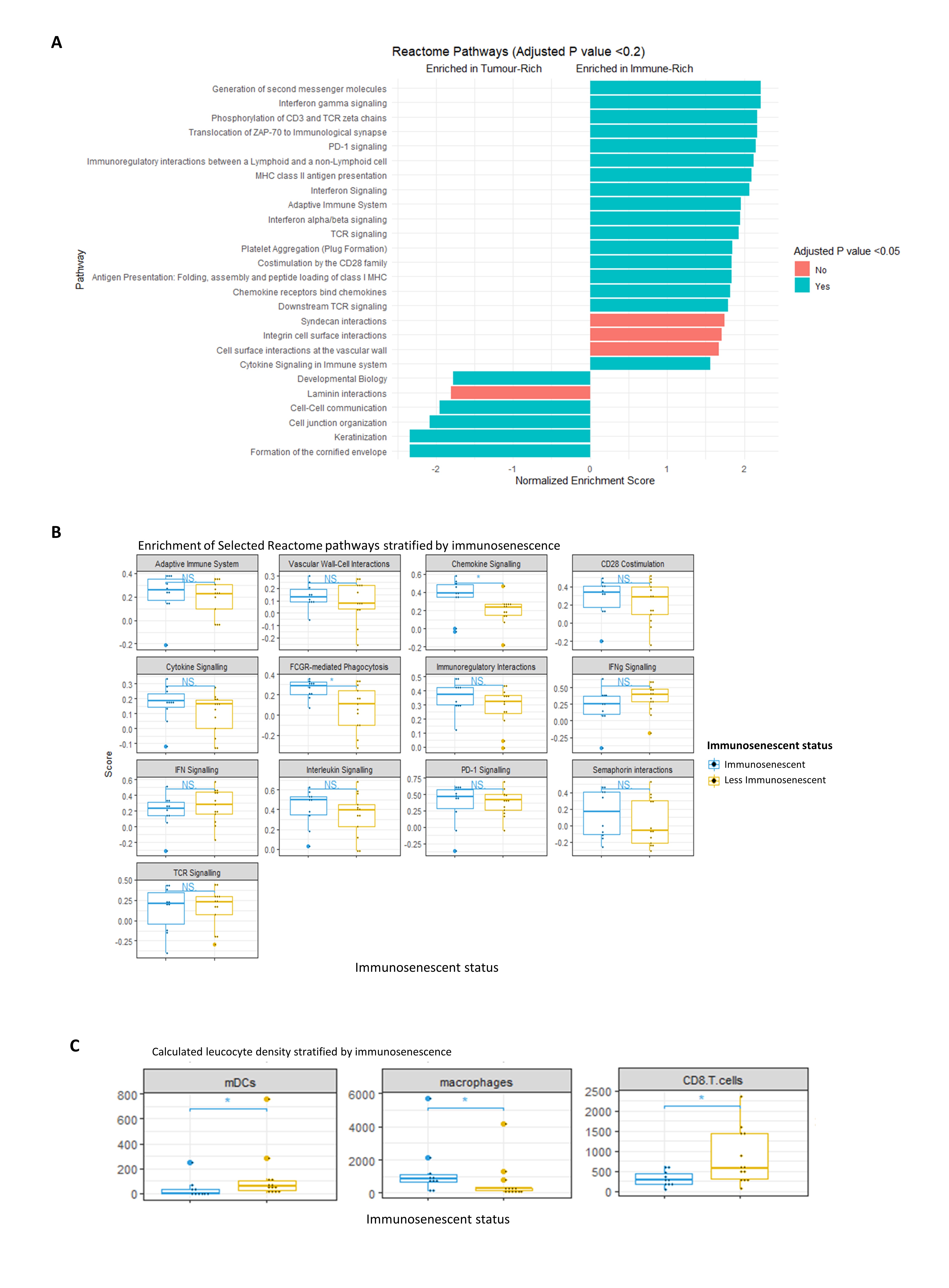 Results: CD8+ and FOXP3+ tumoural T cell density decreased with advancing peripheral blood immunosenescence in KTR but not in NIC on immunohistochemistry. Across the KTR cohort, upregulation of pathways in the peritumoural infiltrate relating to TCR signalling, co-stimulation, chemotaxis and immunoregulation was seen compared to the tumour bed (Figure 1A). Within immunosenescent KTR, there was greater enrichment of pathways relating to chemotactic signalling and phagocytosis were seen (Figure 1B). Cellular deconvolution revealed enhanced accumulation of macrophages with an M2 gene signature, associating with reduced monocytic dendritic cell and CD8+ T cell density (Figure 1C).