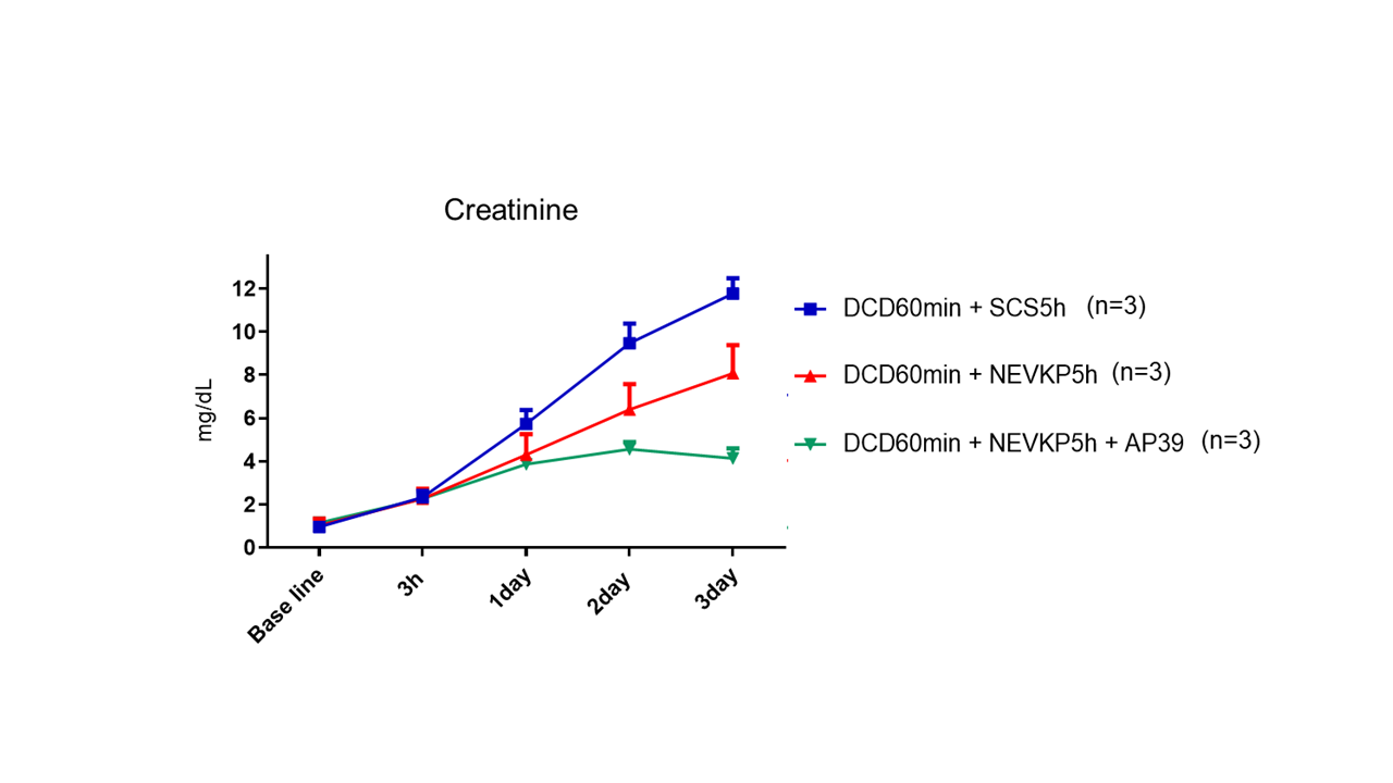 Results: All animals survived the follow-up period in all 3 groups. Grafts preserved with NEVKP had lower serum creatinine (SrCr) on postoperative day 3 compared to the SCS group. Treatment with NEVKP + AP39 further reduced SrCr when compared to the NEVKP group (SrCr SCS vs NEVKP vs NEVKP + AP39: 11.7±0.7 mg/dl vs 8.1±1.3 mg/dl vs 4.1±0.8 mg/dl, mean±SD). This was also true for BUN on postoperative day 3 (BUN SCS vs NEVKP vs NEVKP + AP39: 125±21.7 mg/dl vs 64.7±23.5 mg/dl vs 27.3±2.9 mg/dl). We have performed ATP assay analysis on biopsy-derived cell suspensions from SCS and NEVKP stored grafts. Both ATP levels were increased in the NEVKP group compared with SCS group at the time of pre-implantation (ATP SCS vs NEVKP: 25.6±10.6 nM/10000cells vs 114.8±10.3 nM/10000cells).