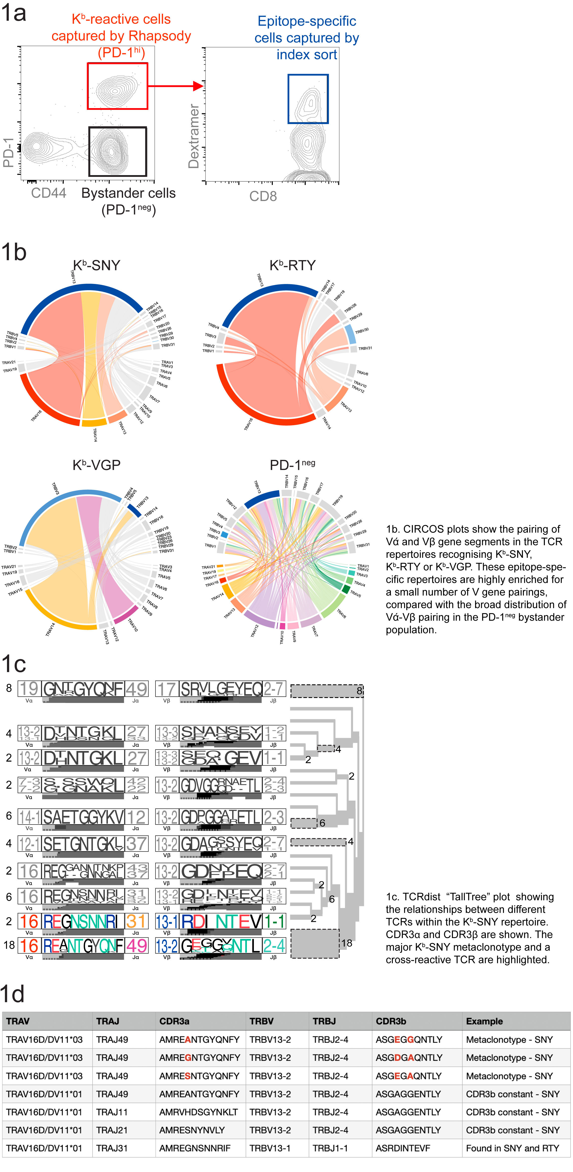 Results: Repertoires for 3 dominant epitopes (Kb-SNY, Kb-RTY and Kb-VGP) were determined (Fig.1b). TCR αβ diversity was significantly reduced among epitope-specific T cells (scores Kb-SNY 47.3, Kb-RTY 69.5, Kb-VGP 279.5) compared with PD-1neg bystander cells (score 78730). Alloreactive repertoires were strongly skewed towards usage of particular V-J gene segments and comprised families of related TCRs including both private TCR clones and public meta-clonotypes (Fig.1b-d). One cross-reactive clone recognised both Kb-SNY and Kb-RTY (Fig.1c-d). A number of clones shared the same b chain paired with different alpha chains (Fig. 1d) while clones with dual alpha chains were also detected. The major meta-clonotypes were represented in multiple mice.