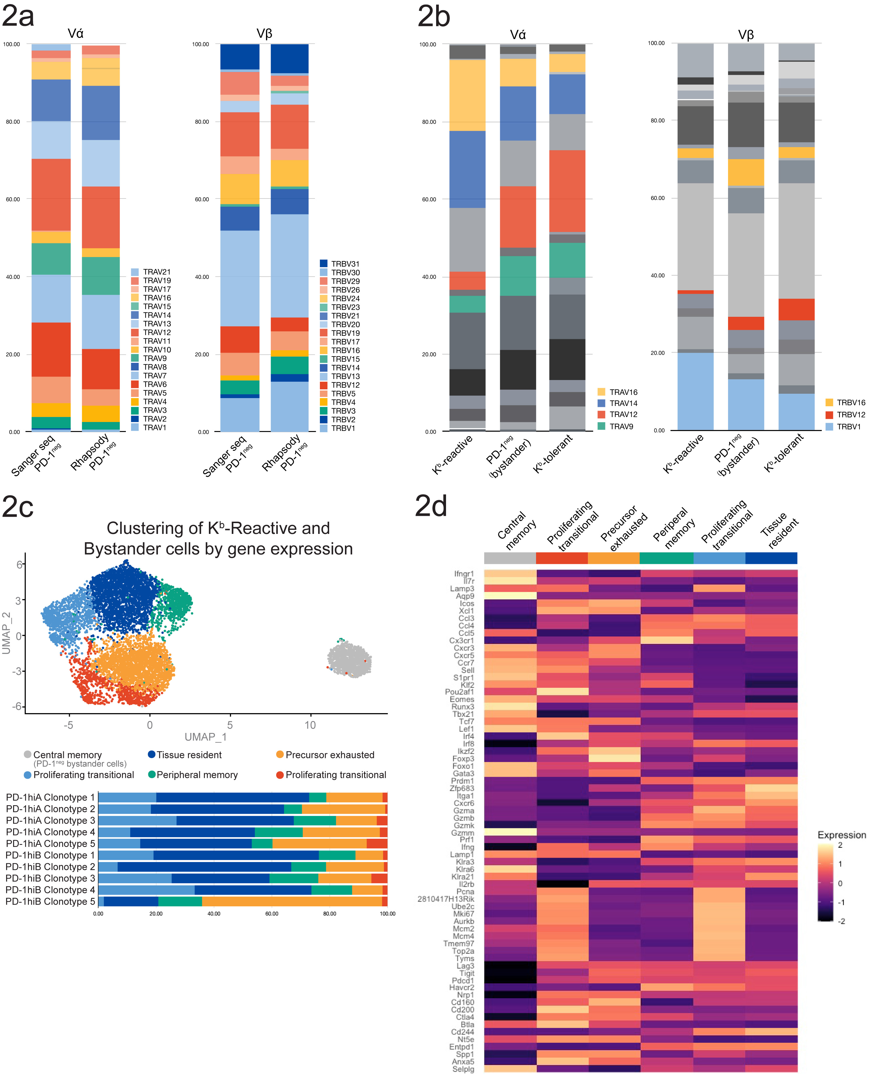 Rhapsody analysis of Kb-reactive (PD-1hi), bystander (PD-1neg) or Kb self-tolerant T cells (from the Kb-transgenic H-2k strain 178.3) permitted profiling of a broader range of donor-reactive T cells. Comparison of V gene segment usage across the range of receptors expressed by PD-1neg cells from Sanger-sequenced or Rhapsody samples (502 or 1151 cells respectively) did not reveal any biases in the repertoire obtained based on the amplification method (Fig. 2a). TRAV14 and TRAV16 were over-represented among the PD-1hi cells compared to PD-1neg or Kb-tolerant cells while cells expressing TRAV9 and TRAV12 were less frequent (Fig 2b). The top 10 clones from each mouse accounted for 32% of all Kb-reactive (PD-1hi) cells. No clonal expansions were observed in the PD-1neg or Kb self-tolerant populations, with negligible overlap between TCR sequences from PD-1hi cells and these populations. Kb-reactive cells segregated into clusters corresponding to liver-resident or peripheral memory, precursor exhausted and proliferating cells, while PD-1neg cells displayed a central memory phenotype (Fig. 2c-d). Individual clonotypes showed distinctive gene expression patterns following activation.