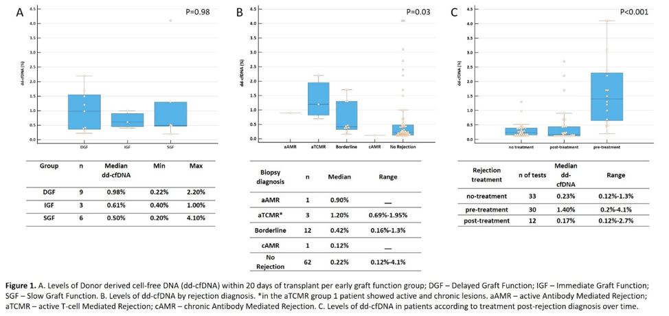 Conclusions: High levels of dd-cfDNA were associated with alloimmune injury irrespective of graft function, showing the clinical utility of this biomarker in the early post-transplant. Patients with DGF are more prone to develop allograft injury, but all patients may benefit of close surveillance in the early post-transplant period. Further evaluation is needed to elucidate the benefits of dd-cfDNA surveillance over biopsy in this clinical setting.