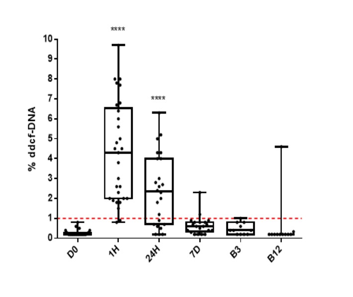 Materials and Methods: We conducted a prospective longitudinal study including all pancreas transplant recipients from our center from January 2017 to December 2018. Plasma samples were collected before transplant (D0), and at 1h, 24h and 7 days (D7) post-transplant, and at time of pancreas biopsy – either surveillance at 3 weeks (B3) and 12 months (B12), or per clinical indication. Biopsies were classified according to the Banff criteria. Dd-cfDNA percentage (%) was assessed using Eurofins Genoma AlloNext® by Next Generation Sequencing (NGS). Gene expression profiles, measured at the time of pancreas biopsy, were analysed with TruGraf®, a Blood Gene Expression Test of Eurofins_Transplant Genomics that uses a PCR-based assay to analyse gene expression from peripheral blood and assign a result of either “TX” (normal, no rejection) or “not-“TX (rejection).