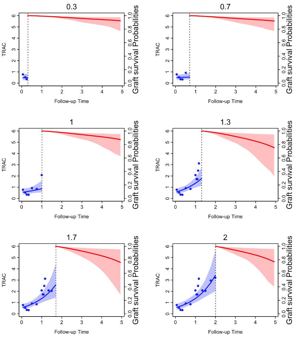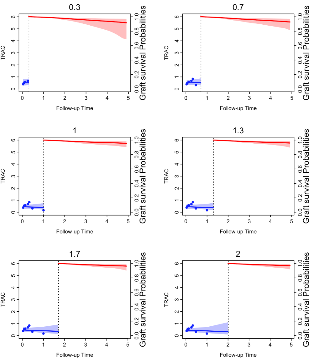Methods: Serial blood samples collected in the first two years post-transplant were analyzed for ddcfDNA using the TRAC test (Eurofins – Viracor, Lees Summit, MO). We used joint modeling method to model the trend of serial ddcfDNA score to predict the 5- year death censored graft survival. We pre-defined 6 time points post-transplant and dynamically plotted two patients 5-year graft survival via the joint modeling method.