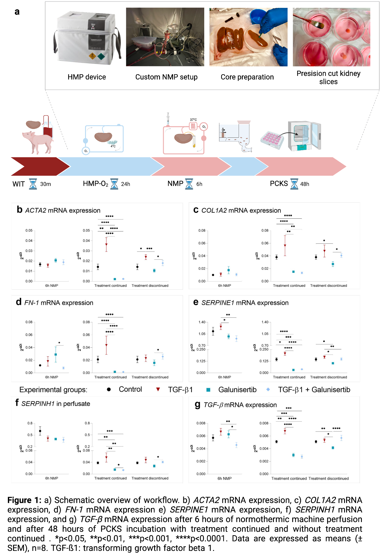 Methods: Porcine kidneys were subjected to 30min of warm ischemia, 24h of oxygenated hypothermic machine perfusion (HMP), and 6h of NMP with treatment (control, TFG-β, galunisertib, or TGF-β+galunisertib; n=8). To determine whether effects persisted upon ceasing treatment, precision-cut kidney slices (PCKS) were prepared from respective kidneys and incubated for 48h with treatment continued and discontinued (Figure 1a).