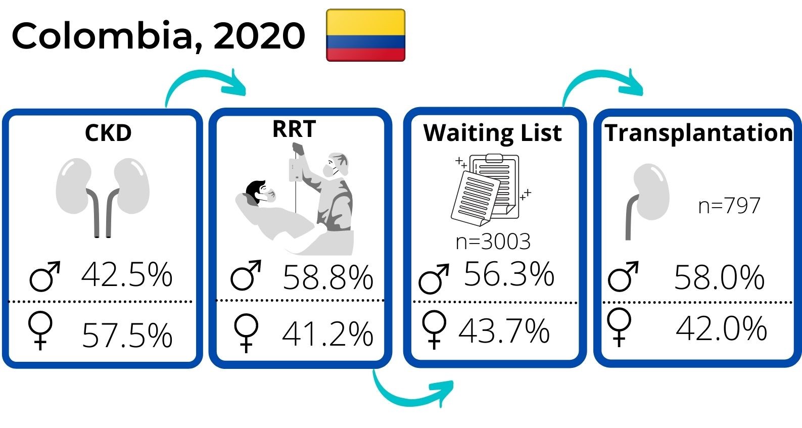 Conclusion: In Colombia according to national records, there are proportionally more females with ESRD, nevertheless there are less females in waiting list and transplanted annually. This may represent diverse barriers which should be identified and addressed accordingly in order to improve female access to renal replacement therapy.