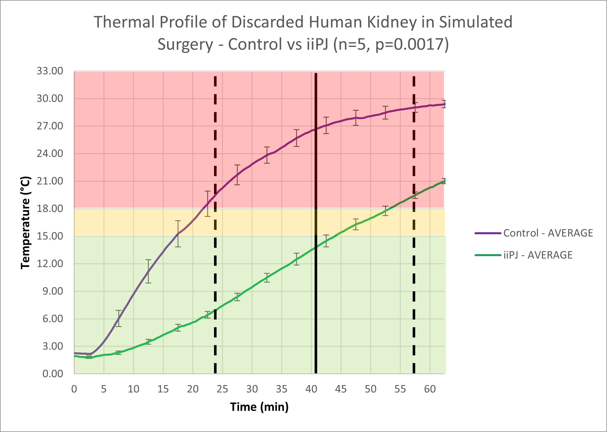 Results: The control kidney core temperature reaches the 15°C threshold temperature at 17.3±1.8 minutes and the 18°C threshold at 20.9±2.0 minutes. This time to reach the warm ischemia threshold temperature is below the average global surgical time of 40.5±17.5 minutes. The iiPJ protected kidney reaches the 15°C threshold temperature at 44.5±1.9 minutes and remains within the 18°C threshold till 53.3±1.3 minutes. This amounts to an additional thermal protection of 27.2±3.7 minutes (n=5, p=0.0017) for the iiPJ protected kidneys when compared to the current surgical practices represented by the control kidneys.