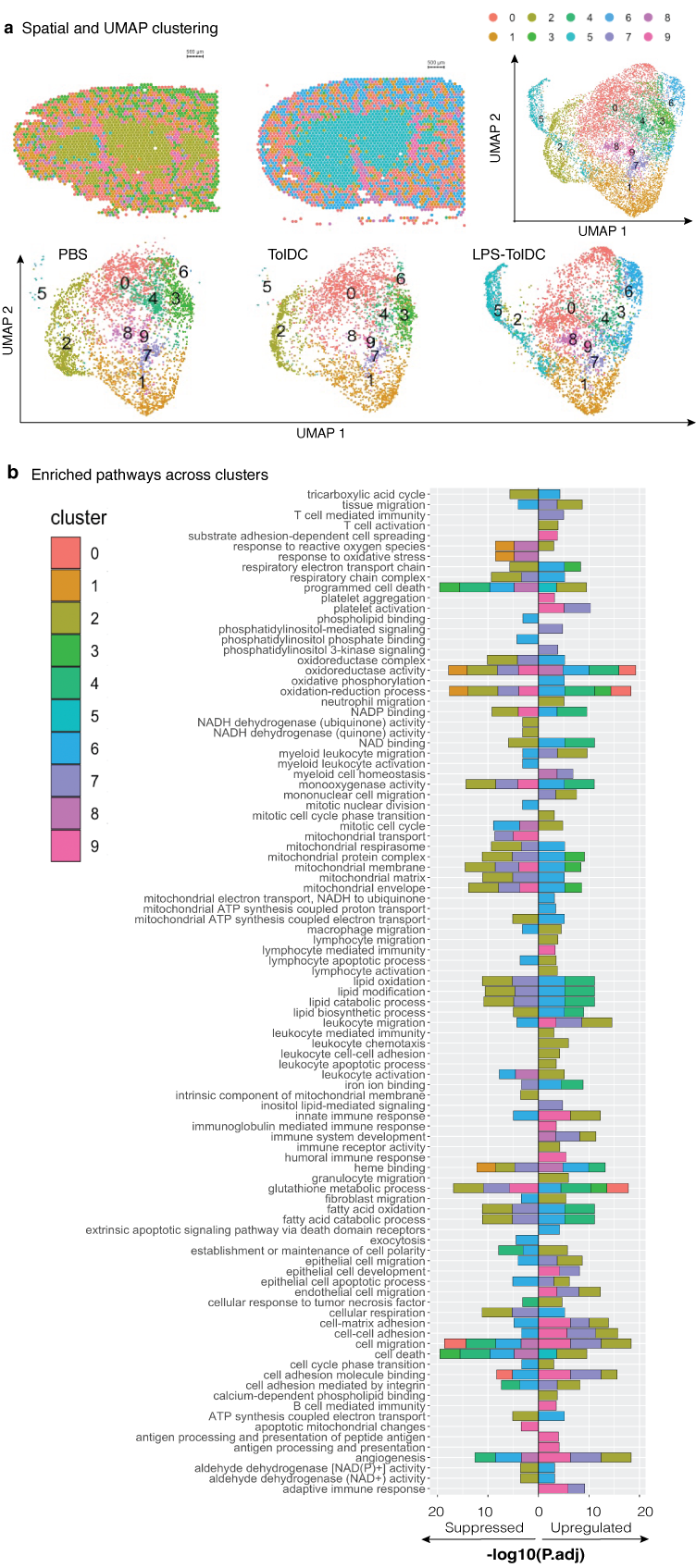 Figure 2: A) Spatial transcriptomic and UMAP projections from 6 mice kidneys (n=2 from PBS/TolDC/LPS-TolDC) and B) enriched pathways for each cluster in a cumulative bar graph.