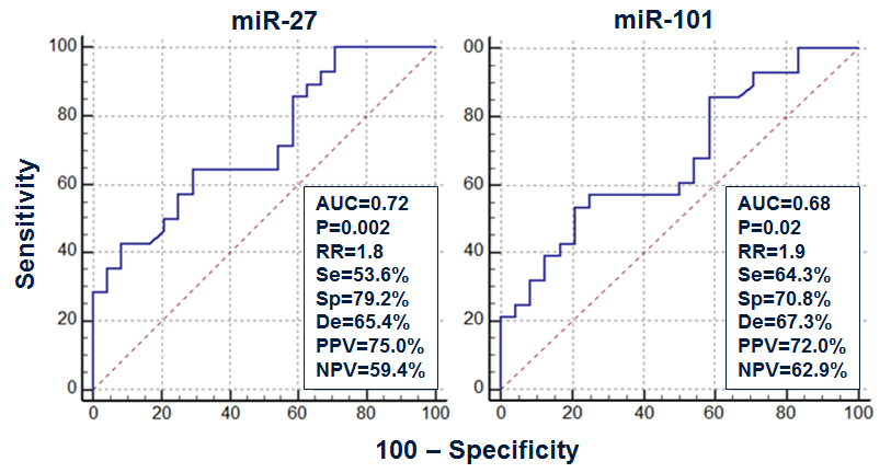 Results: The miR-424 level didn’t differ (p=0.47) in recipients with (n=39) and without acute graft rejection (n=44), however miR-27 and miR-101 levels are significantly lower in recipients with acute graft rejection than in recipients without (p=0.01 and p=0.02 resp.). By the way the diagnostic value of miR-27 and -101 and its’ threshold value for heart transplant acute rejection was found: when miR-27 expression level is below threshold value the relative risk of acute rejection is RR=1.8 [95% CI 1.13–3.01]; miR-101 – below threshold value RR=1.9 [95% CI 1.13–3.37]. For miR-27 the sensitivity (Se) and specificity (Sp) were 53.6% and 79.2%; for miR-101 – 64.3% and Sp=70.8% resp. (Fig. 1).