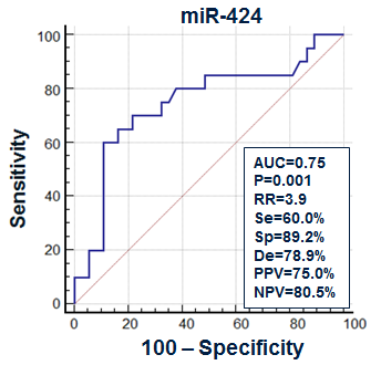 MiR-27, -101 and -424 levels were determined in heart transplant recipients with bacterial infections after HTx (n=20). More than 50% of bacteria spectrum were gram-negative pathogenes: Аcinetobacter baumannii (55%), and Klebsiella pneumoniae (40%). MiR-27 and -101 didn’t differ in recipients with and without infection (p>0.05), but miR-424 level was significantly higher in heart transplant recipients with gram-negative bacteremia (p=0.02). When miR-424 level is above -5.72 fold change, the relative risk of bacteremia is RR=3.9 [95% CI 1.94–7.61]; Se=60.0%; Sp=89.2% (Fig. 2).