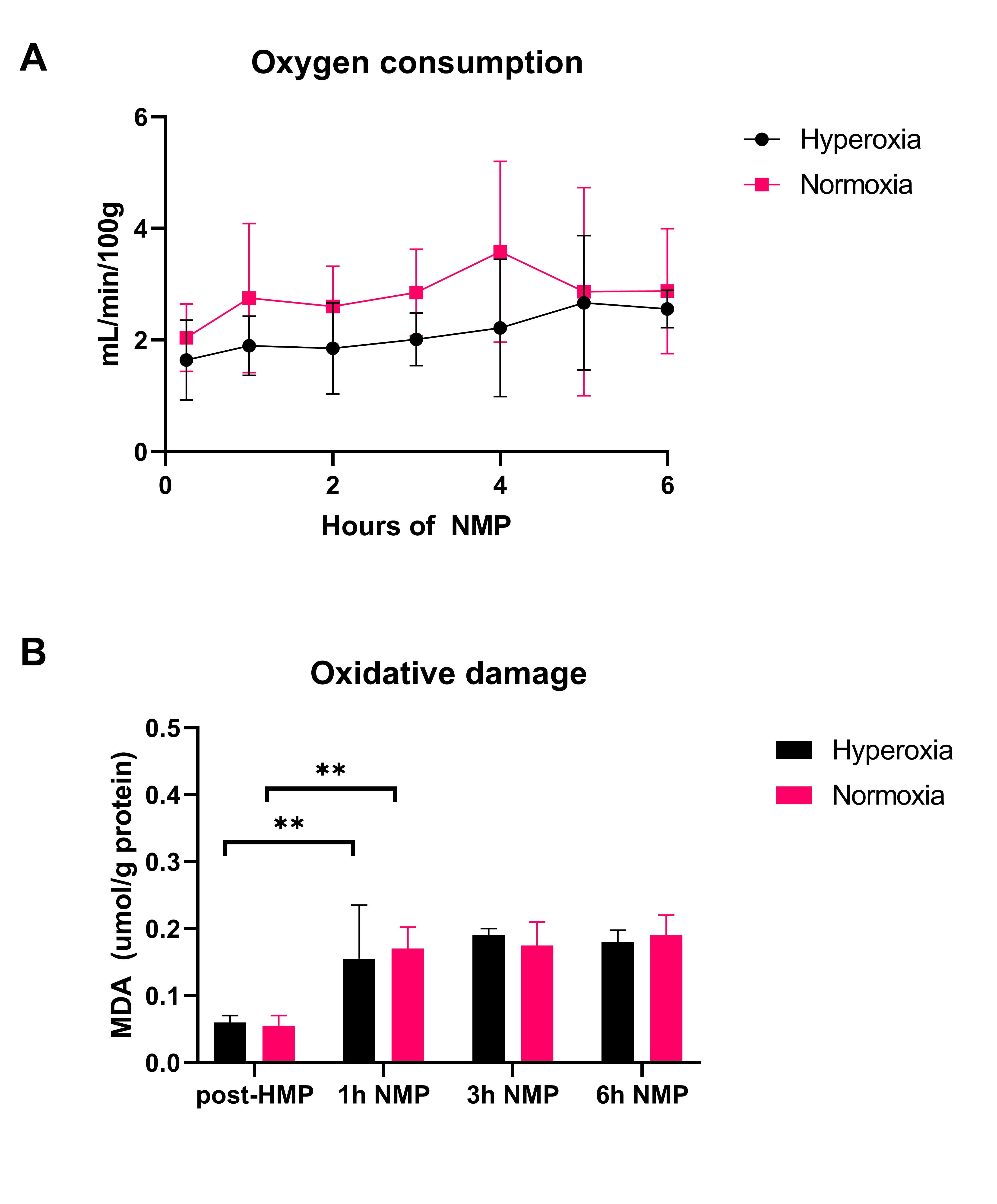 Results: Kidney function, measured as creatinine clearance and fractional sodium excretion was similar for both groups. Likewise, perfusate injury markers were similar for both groups. Total oxygen consumption tended to be higher in the normoxia group (p=0.08) (Figure 1A), and tissue ATP levels were similar at all timepoints. Oxidative stress measured by malondialdehyde (MDA) formation increased significantly after initiation of NMP (p<0.01), but did not differ between both groups at all timepoints (Figure 1B).
