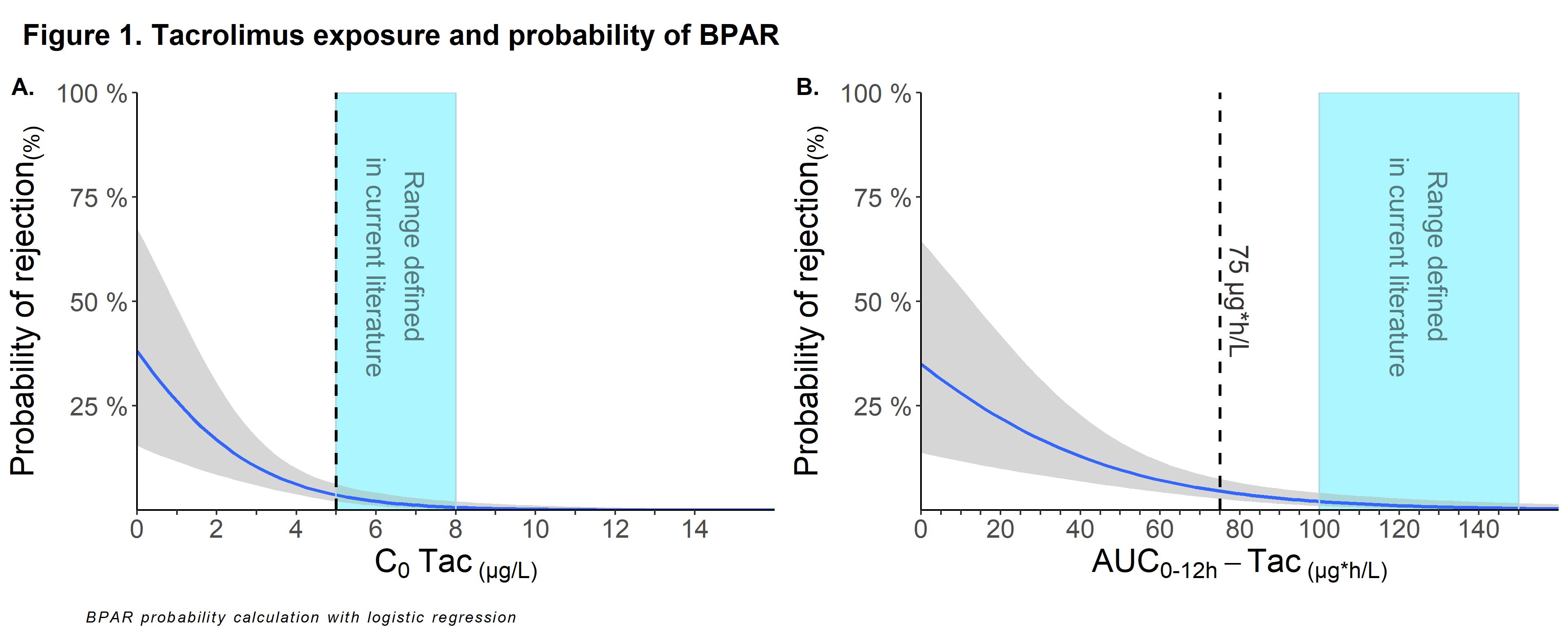 Results: A total of 16 out of 475 (3.4%) KTRs experienced BPAR between year 1-3 post-transplant. Incidence of BPAR in KTRs with high and low IPV was 5.0% vs 1.3% (p=0.01). Tac was significantly associated with BPAR within year 1-3 posttransplant with an unadjusted HR (uHR) of 0.61 (95%CI: 0.49-0.76; p<0.001) and adjusted HR (aHR) of 0.54 (95%CI: 0.40-0.70; p<0.001) for every 1 µg/L increase in C0, and an uHR of 0.55 (95% CI: 0.42-0.73; p<0.001) and aHR of 0.44 (95% CI: 0.30-0.66; p<0.001) for every 20 µg*h/L increase in AUC0-12h. AUC0-12h-mpa was not associated with BPAR. Probability of BPAR increased exponentially when C0 or AUC of tac was below respectively 5 μg/L or 75µg*h/L (Figure 1). Escalation of Tac levels above 7 μg/L did not lead to meaningful further reduction in BPAR. AUC showed stronger association with BPAR as compared to C0 when using correlation plots (not shown). In KTRs with low IPV lower levels of tac were better tolerated with regards to BPAR as compared to high IPV.