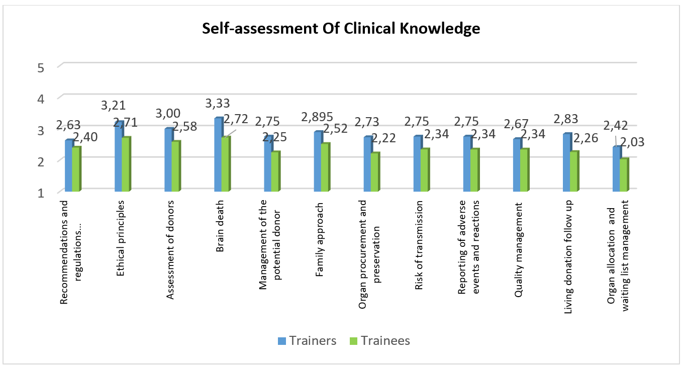 Methods: Training programmes and OD self-assessment (SA) of clinical knowledge (A/n21) and of non-clinical competencies (B/n18). SeA universities targeted 3 groups: university personnel, faculty members and potential postgraduate trainees. Train the trainers (TxT) blended programme for SeA trainers healthcare professionals (HCPs). Pre and post course evaluation results were compared. Multilevel blended Postgraduate Programme in Organ Donation (PPOD) targeting HCPs combining academic training (online training and local & international seminars) with bedside projects (On-the-job- projects and awareness events). Pre and post course evaluation results were compared.
