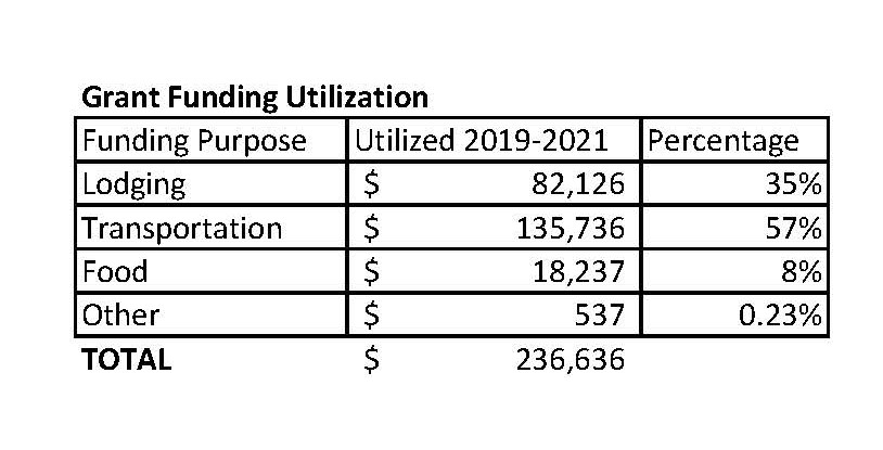 Results: Between 2019-2021, 9 hospitals received a total of $313,371. Grant funds were distributed to 1,947 non-unique, patient/caregiver units (Pt/CGs), totaling $236,636 in utilization and an average of $121 per distribution. Of the $236,636, $135,736(57%) was utilized for transportation support, $82,126(35%) was utilized for lodging support, $18,237(8%) was utilized for food support, and the remaining was other.