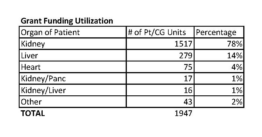 Of the 1,947 Pt/CGs receiving funds, 1,517 were to kidney Pt/CGs(78%), 279 were for liver Pt/CGs(14%), and 75 were for heart Pt/CGs(4%).