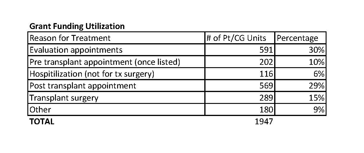 Method: The OPO affiliated Foundation established The Transplant Center Family Support Grant Program through which 9 RCs can apply for up to $25,000 a year to support their patients’ travel, lodging and food needs related to their transplant care. Each RC application was vetted and approved based on the grant guidelines. Approved applicants were required to implement systems for releasing and tracking disbursed funds and submit quarterly logs with de-identified information on utilization.