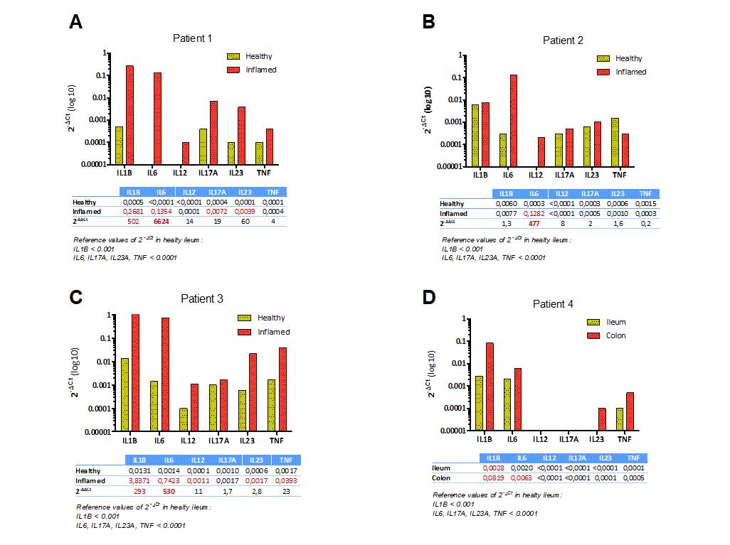 Methods: Two multivisceral recipients with episodes of ulcerative enteritis refractory to corticosteroids and infliximab treatment were studied, as well as, two ITx candidates with intestinal failure and inflammatory colitis and enteropathy, respectively. Mucosal biopsies were taken from affected and healthy areas and frozen in RNAlater until RNA extraction. Expression of cytokine genes which are targeted by approved drugs (IL1B, IL6, IL12p70, IL17A, IL23 and TNF) was determined by qPCR. Gene expression was calculated as 2-ΔCt using GAPDH as endogenous control.
