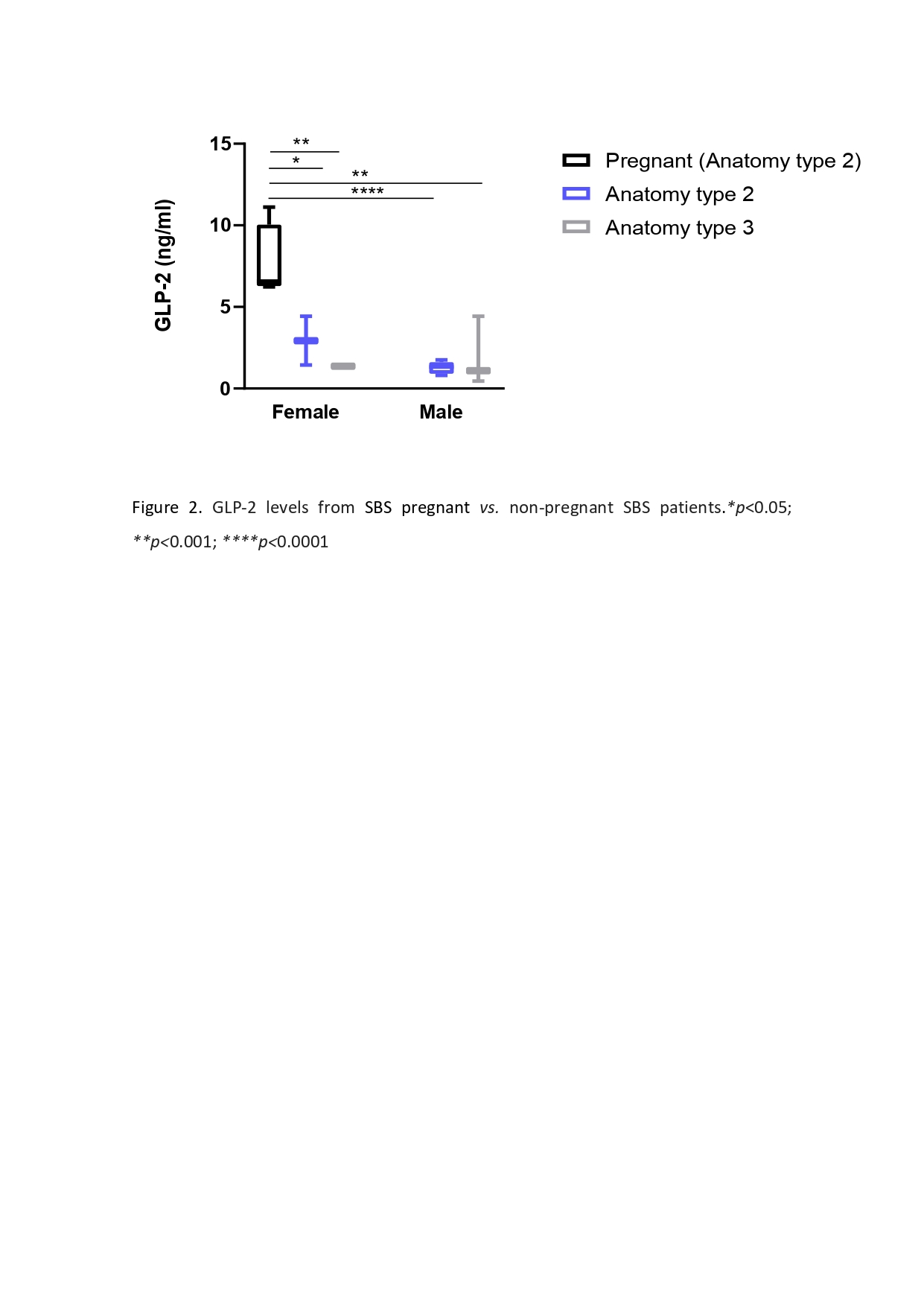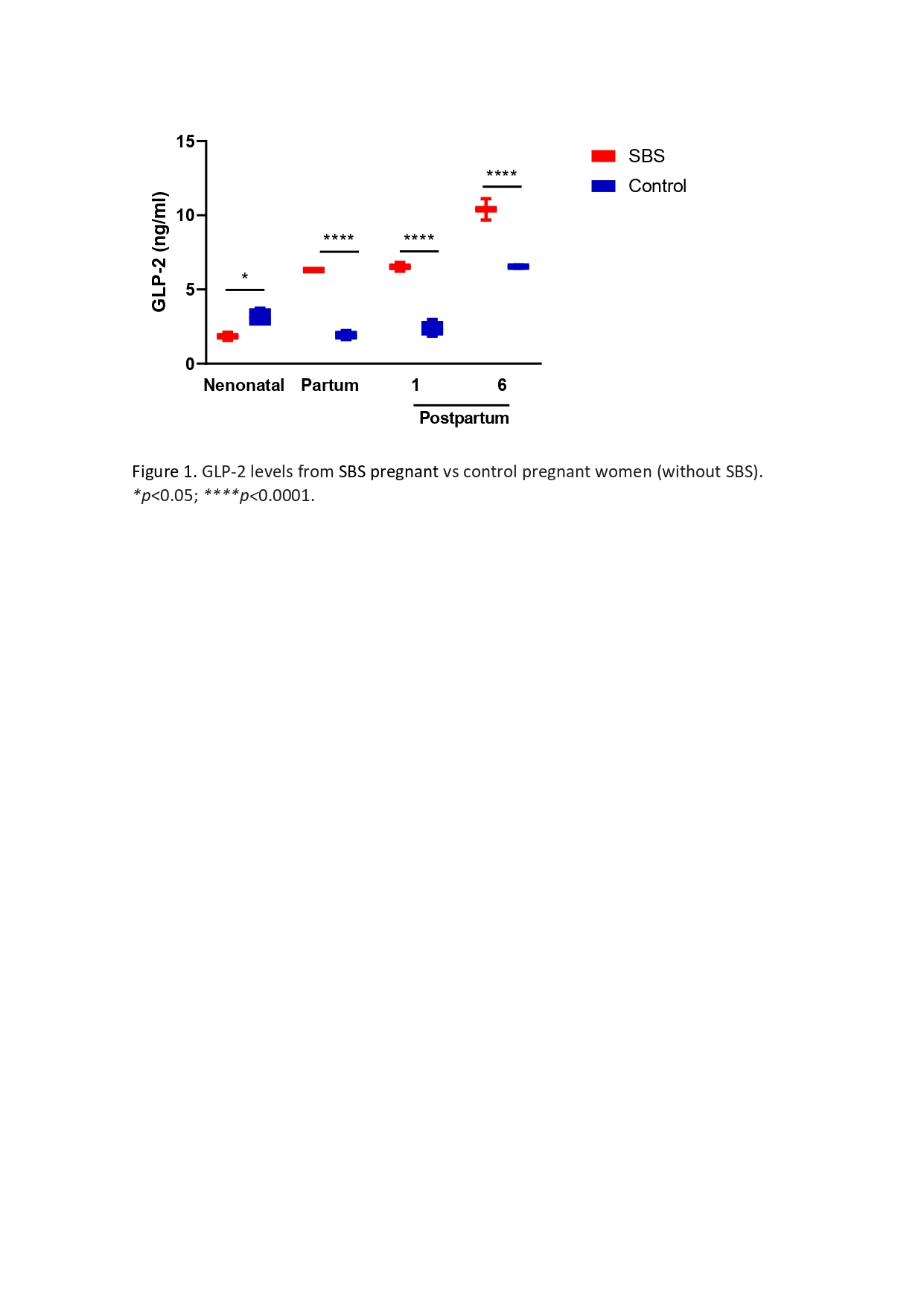 Results: Our results indicated that eGLP-2 levels were significantly lower in neonatal than maternal plasma from our pregnant SBS patient compared to controls (Table 1). During postpartum, eGLP-2 levels increased up to the six-month in both groups (Figure 1). Interestingly, our pregnant SBS patient showed significantly higher GLP-2 levels respect than controls (Figure 1) and non-pregnant SBS patients (Figure 2).