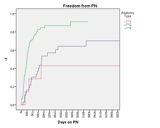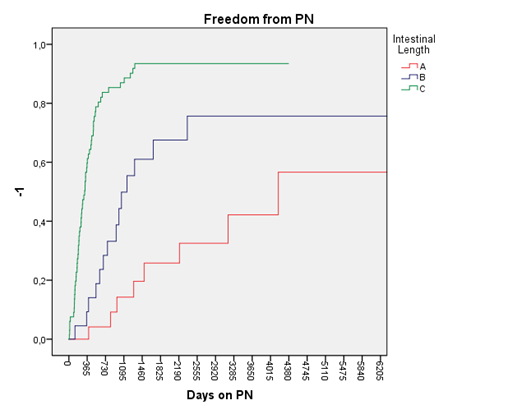 Materials and Methods: A retrospective analysis from a prospectively fill data base including CIF/SBS patients was performed. Variables included were SBS etiology, intestinal rehabilitation surgery performed, post-surgical intestinal length, post-surgical anatomy type, time on PN and medical treatment implemented and Kaplan Meier analyses for PN independency and survival was done using SPSS v20.0.