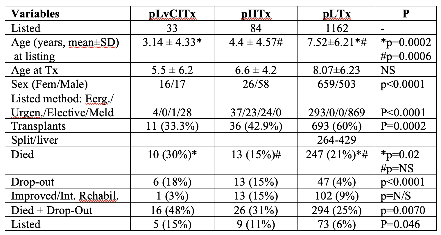 Results: A total of 33 pLvCITx were included in the analyses and compared to 84 pIITx and 1162 pLTx (table 1). The total number of pLvCITx in P1 was 8 and in P2 3, the number of IITX was 26 and 10 respectevily; and the number patients who died on each list were: 5 and 6 for the pLvCITx; 4 and 4 for the pIITx (p=N/S). The number of drop outs by periods for pLvCITx was: 5 and 1; while them were 10 and 3 for the pIITx group.