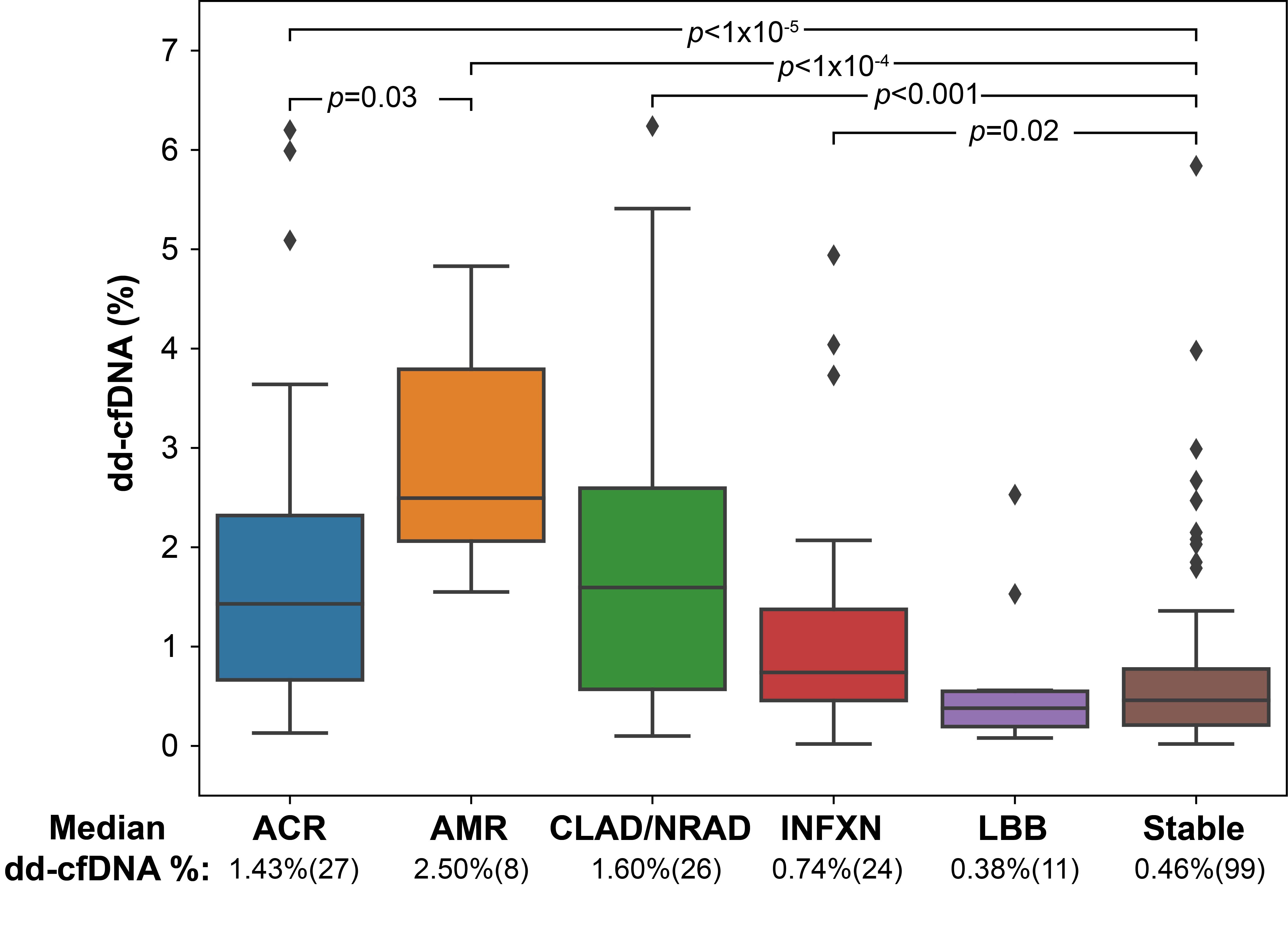 Methods: We measured dd-cfDNA fraction using a novel SNP-based assay in prospectively collected plasma samples paired with clinical-pathologic diagnoses. dd-cfDNA fraction was compared across clinical-pathologic cohorts: stable, ACR, AMR, isolated lymphocytic bronchiolitis, CLAD/neutrophilic-responsive allograft dysfunction (CLAD/NRAD), and INFXN. Performance characteristics were calculated for AR and combined allograft injury (AR+CLAD/NRAD+INFXN) versus the stable cohort.