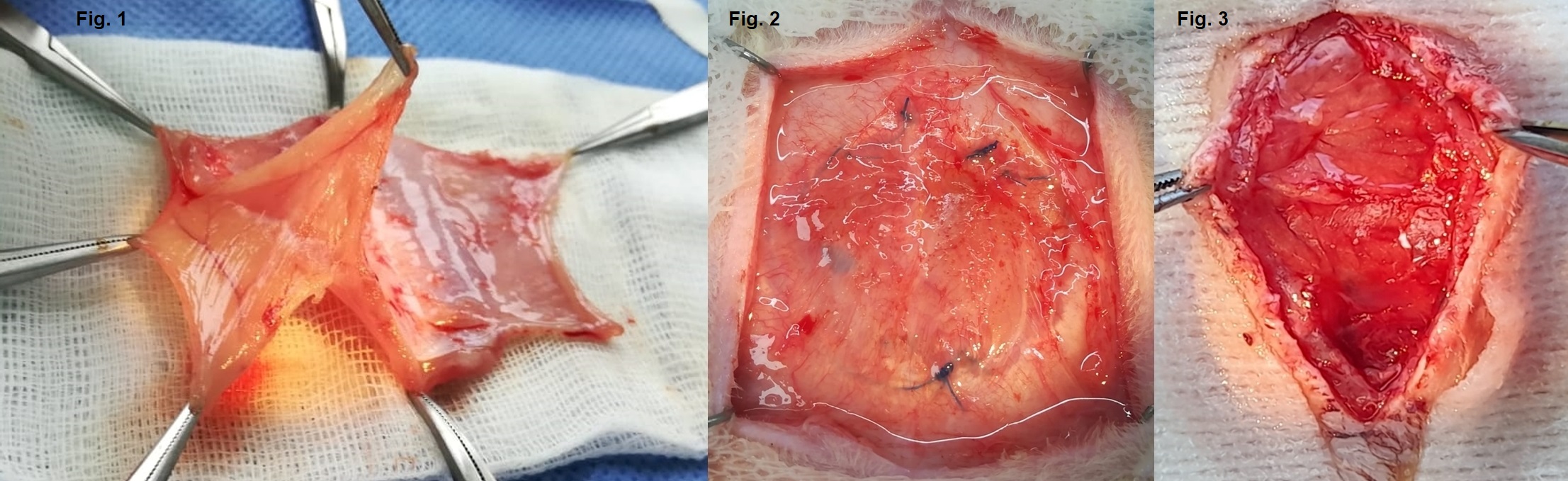 Results: 6 transplants of the abdominal rectus fascia (TxARF) were performed. All donors were female Sprague Dawley rats, while the recipients were 3 Sprague Dawley (3 isogenic TxARF) and 3 Wistar females (allogeneic TxARF). The skin was separated, and the abdominal muscle wall was completely removed to then perform the dissection under a microscope (Fig. 1). TxARF was done utilizing a continuous suture kind Surget with 6-0 Prolene, after removing the ARF and muscle of the recipient (Fig. 2), the skin is closed over the fascia. Once the Tx was finish a strict clinical follow-up of each rat was carried out providing initial treatment with Tramadol and Ceftriaxone; 30th day survival was 100%, 2 recipients developed seromas on days 5 and 11, both isogenic ARF. The visual observation of the grafts showed absence of tissue stiffness and the presence of macroscopic neovascularization (Fig. 3) None of the grafts presented visceral adhesions at the end of the observation period. On histological inspection, the grafts showed, no presence of leukocytes or apoptosic cells, the adjacent native muscle tissue did not present particularities.